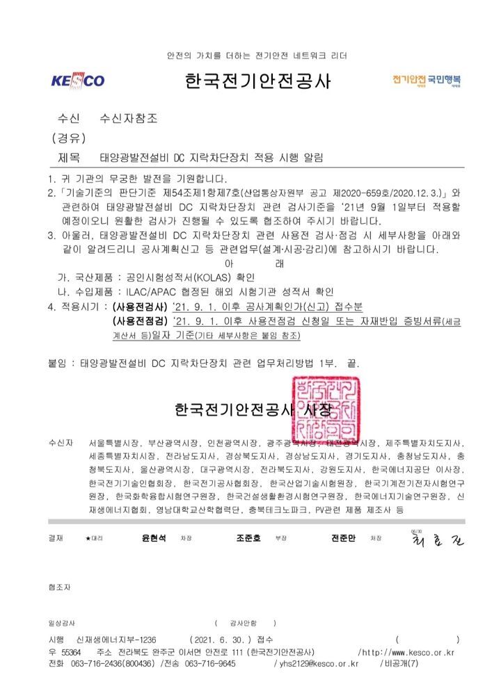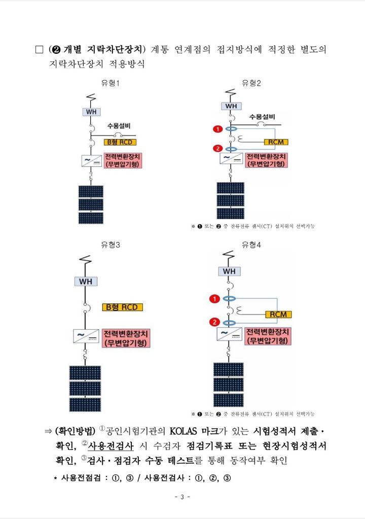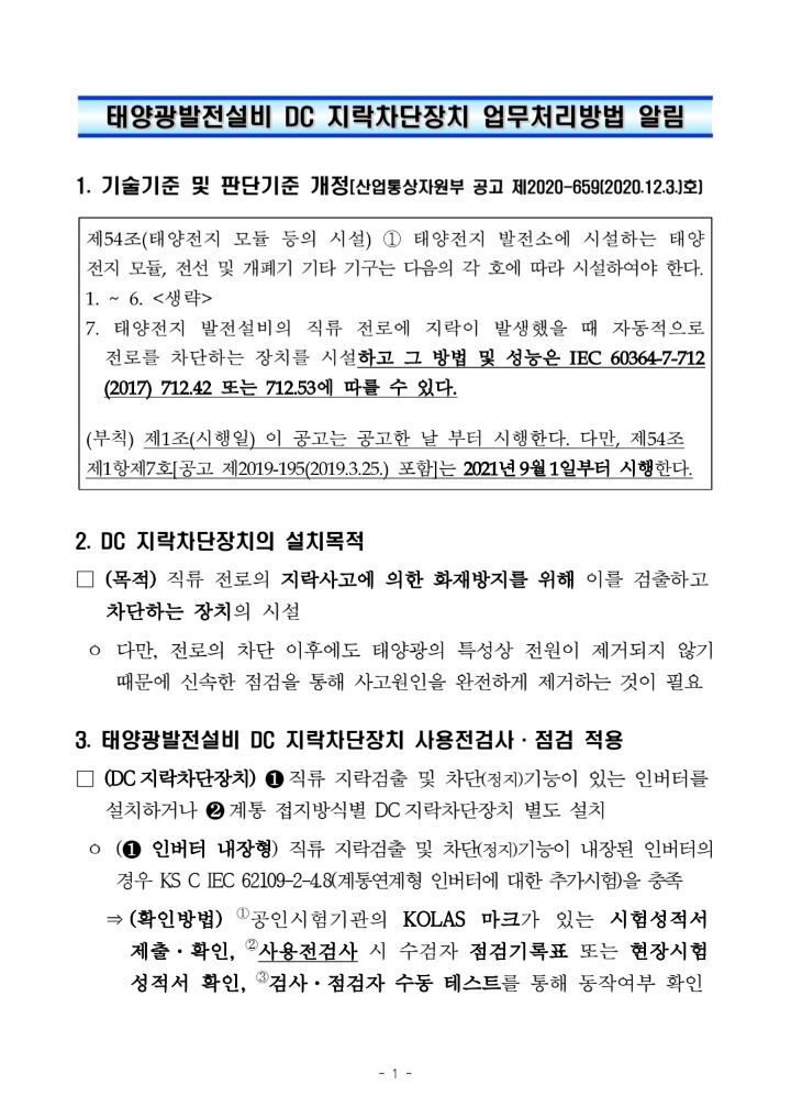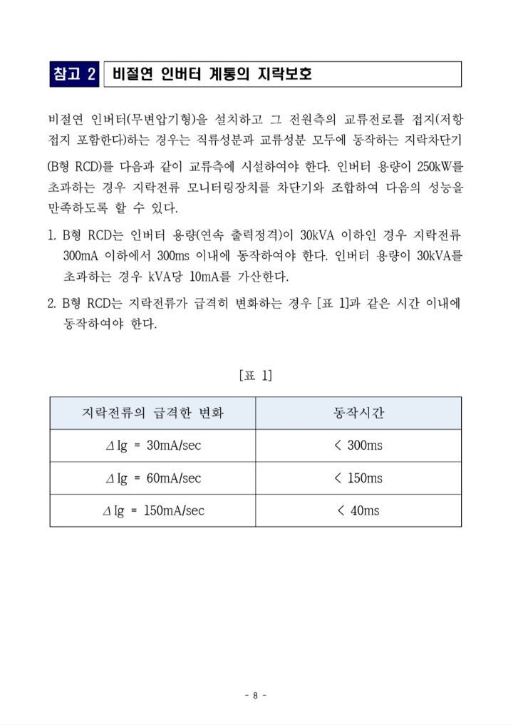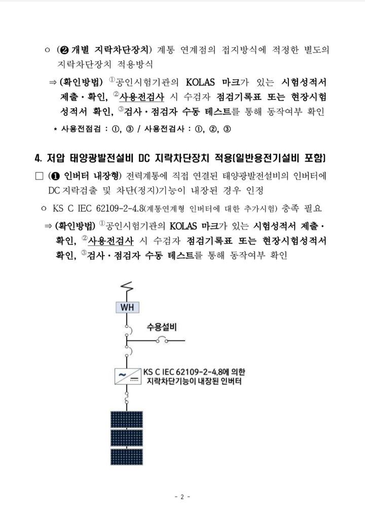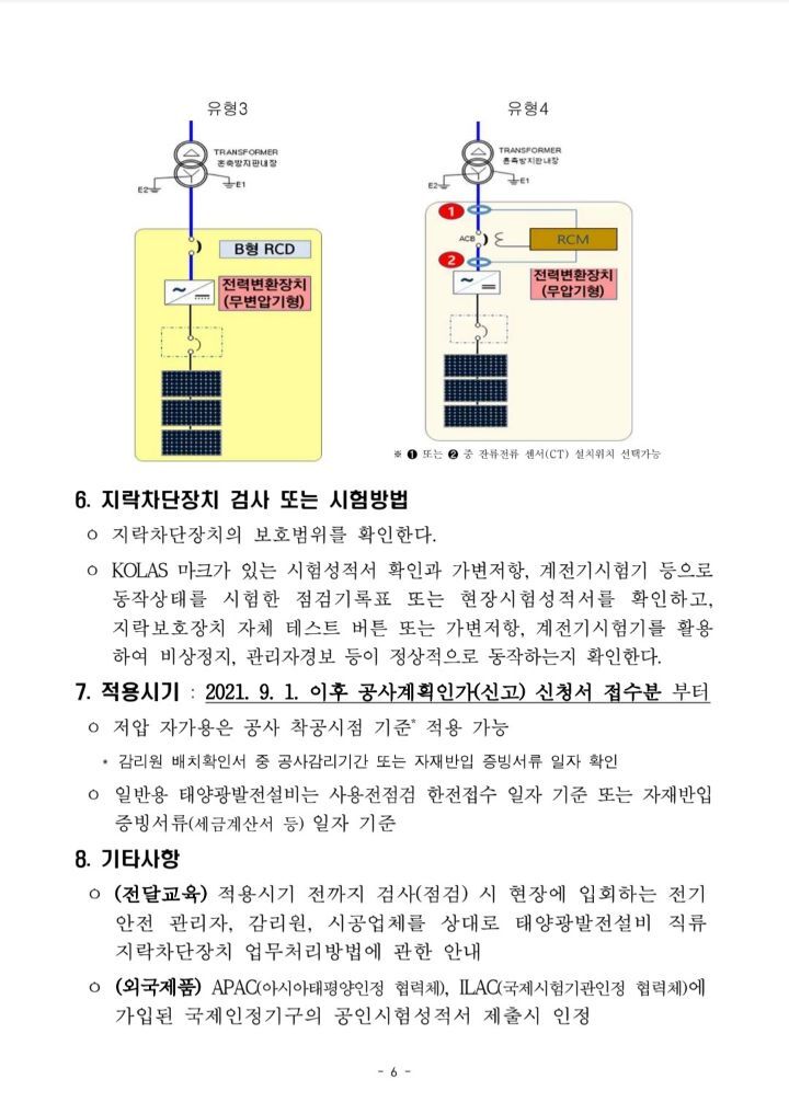 9월1일부터 태양광발전설비 DC측 지락차단장치 적용 작성자솔라플래너|작성시간21.08.09|조회수1,262 목록 댓글 1 글자크기 작게가 글자크기 크게가 9월1일 이후 공사계획신고분부터 태양광발전설비의 DC측에 지락차단장치를 설치해야 합니다.인버터에 지락차단장치가 내장된 경우가 많으나 없을 시 별도의 지락차단장치를 설치해야 합니다. 다음검색 현재 게시글 추가 기능 열기 북마크 공유하기 신고 센터로 신고 댓글 댓글 1 댓글쓰기 답글쓰기 댓글 리스트 작성자지스토니 | 작성시간 22.04.15 지락 차단장치 설치필요 유무 확인이 필요 하겠네요.. 댓글 전체보기