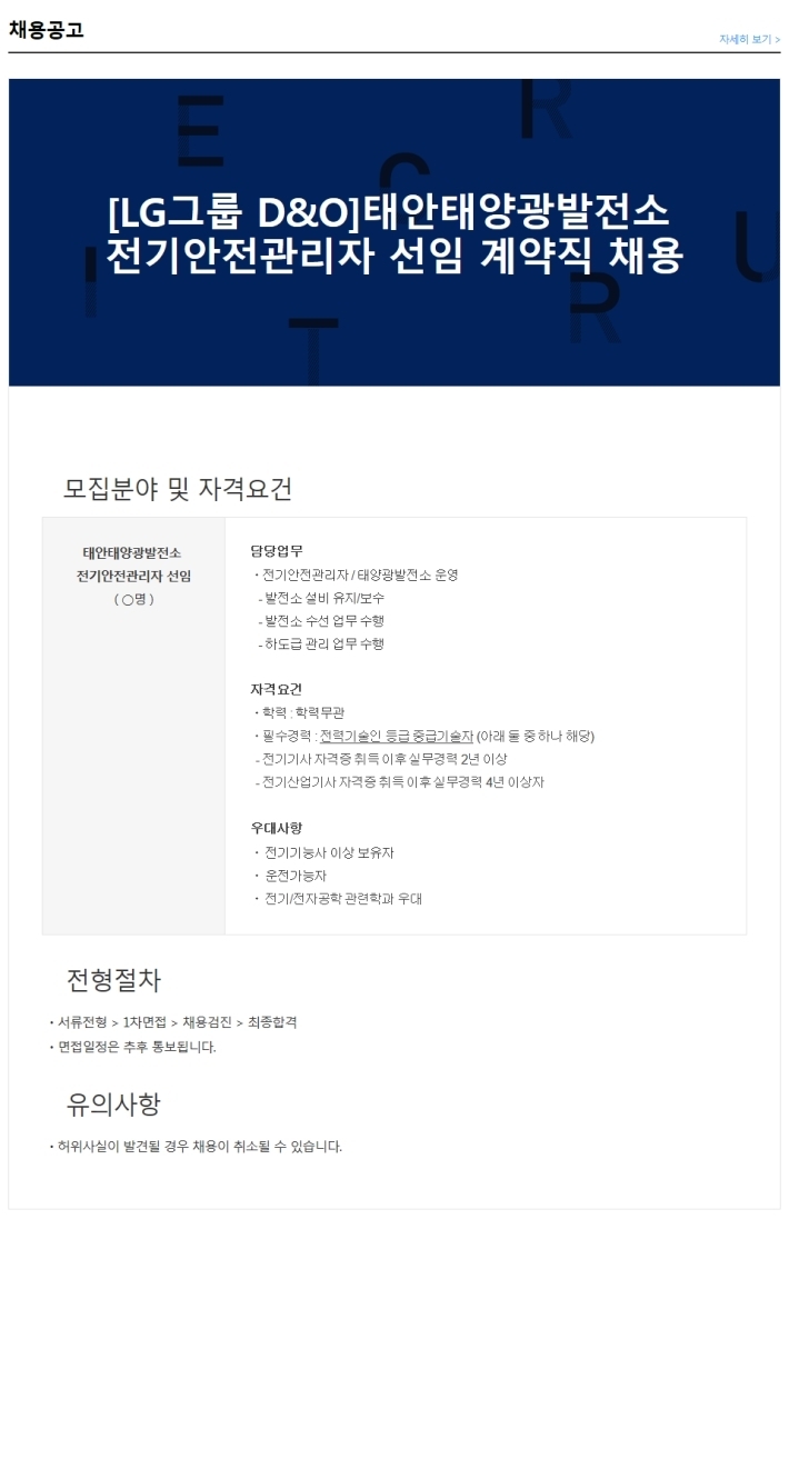 [LG그룹 D&O]태안태양광발전소 전기안전관리자 선임 계약직 채용