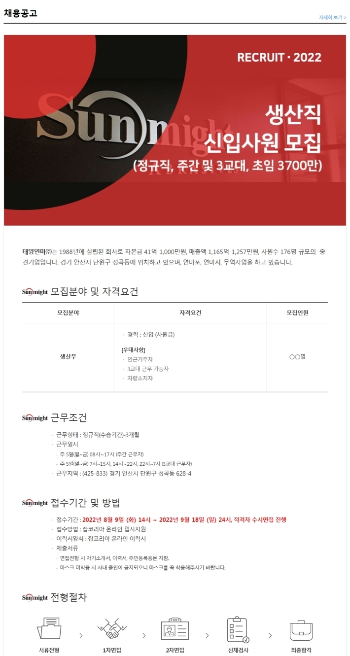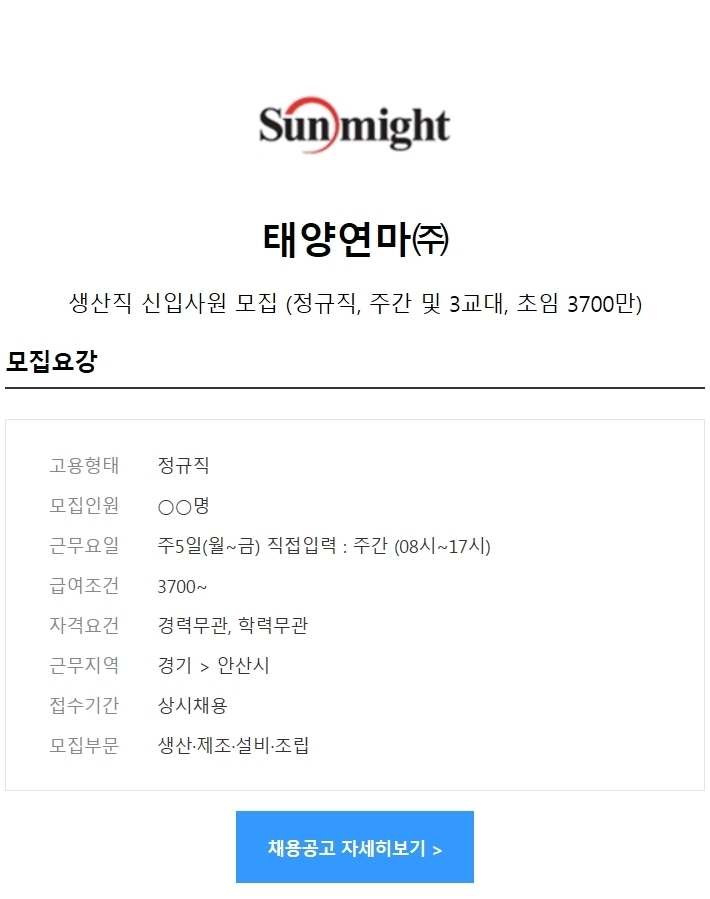 생산직 신입사원 모집 (정규직, 주간 및 3교대, 초임 3700만)