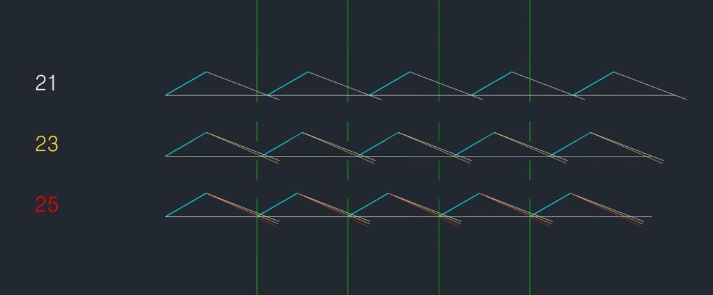 아래는 입사각 21도의 경우, 23도의 경우, 그리고 25도의 경우 어떻게 달라지는 지를 표현한 것이며,