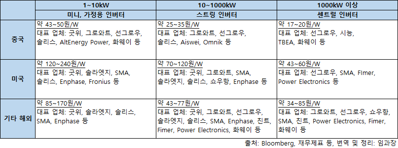 전 세계 인버터시장은 설치 장소와 환경에 따라 크게 가정용, 상업용, 대형발전소용으로 나눌 수 있다. 그리고 국가별 비중으로 나누면 크게 중국, 미국, 기타 해외시장으로 나눌 수 있다.