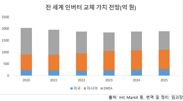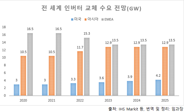 인버터 교체 주기는 약 10년 정도이다. 2011년 신규 인버터 설치 규모가 처음으로 31GW를 돌파했는데, 향후 5년 동안 매년 약 30GW 정도의 인버터 교체 수요가 발생할 전망이다. 이를 상업용 스트링인버터로 모두 교체한다고 가정한 후, 이 전체 금액을 환산하면 매년 약 1,700억 원 규모 정도에 이를 것으로 전망된다.