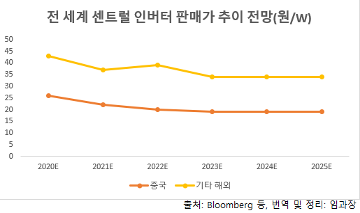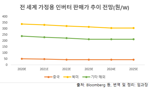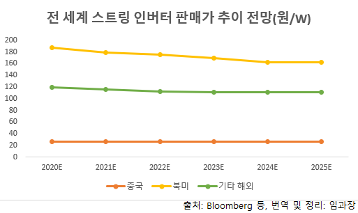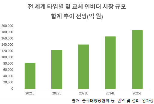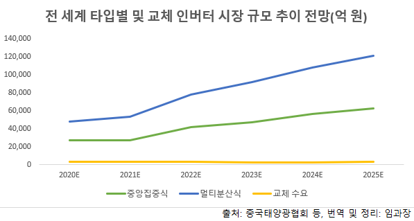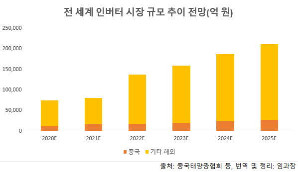 최근 인버터시장 판매가격에 근거해 예상해보면 2020~2025년 전 세계 태양광 인버터 시장규모는 약 7.8조에서 약 18.6조까지 대폭 증가할 것으로 보인다. 이 가운데 중국 시장은 약 1.2조에서 약 2.8조까지 증가, 비중국 시장은 약 6.3조에서 15.5조까지 확대될 것으로 보인다.