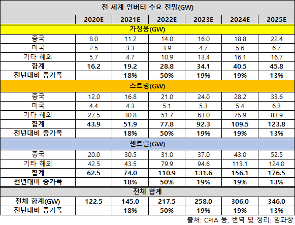 아래 표는 인버터를 가정용 / 스트링 / 센트럴로 나눠 전 세계 향후 5년의 수요 전망을 정리한 것이다.