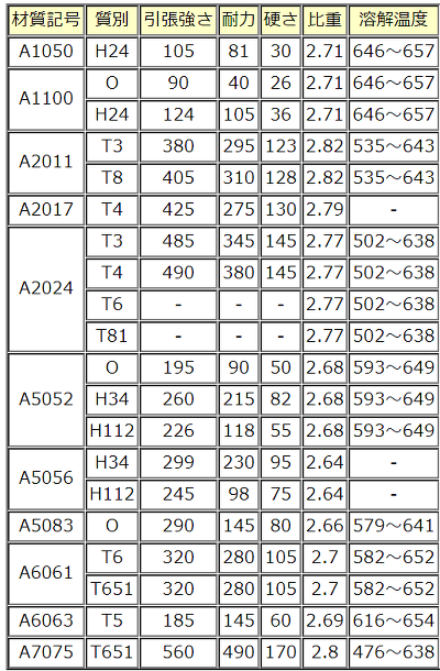 * 인장 강도 · 내력 : N / mm2 경도 : 비커스 경도 (Hv) 비중 : g / cm3 용해 온도 : ℃