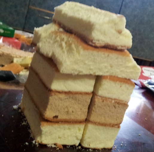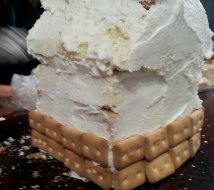 3. 그 위에 생크림을 발라요. 그래야 과자가 잘붙어요. 건빵도 붙이고