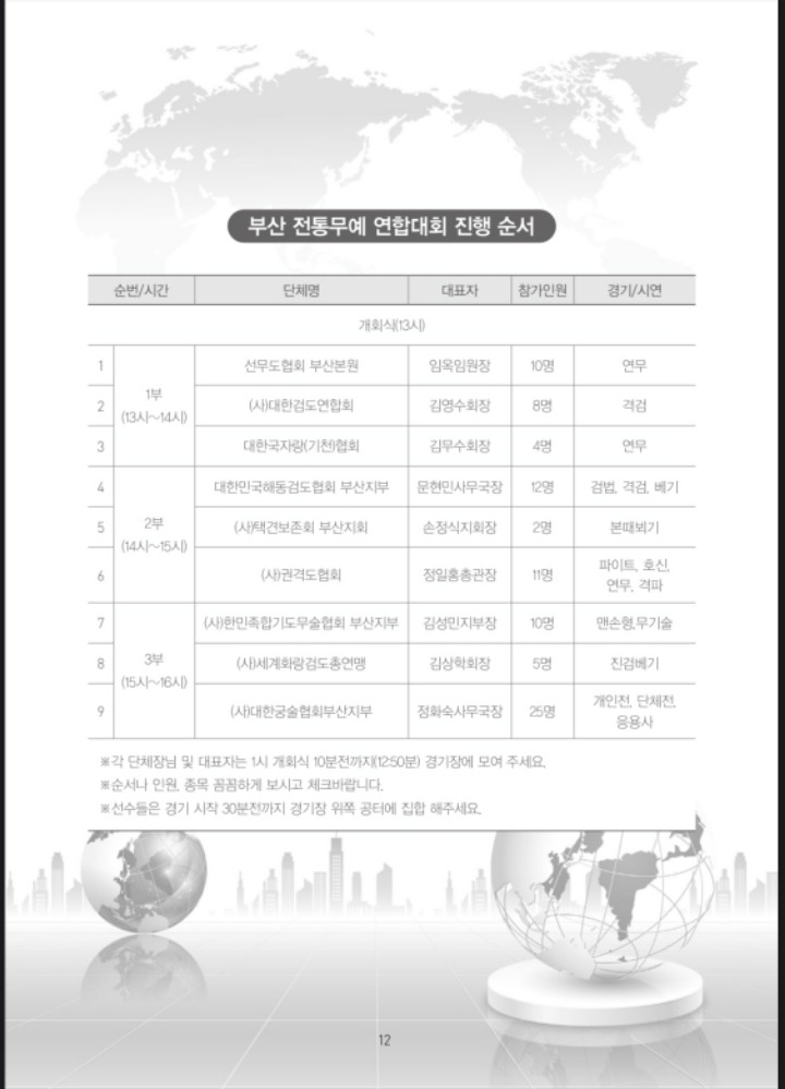[공지]2020ㆍ부산 전통무예연합대회 작성자(무관)임법사|작성시간20.11.06|조회수45 목록 댓글 0 글자크기 작게가 글자크기 크게가 2020년ㆍ11월 8일 수영사적공원에서전통무예단체들의 시연이열립니다~선무도는 1부 첫순서로선무도부산본원회원님들의시연이 선보입니다~ 다음검색 현재 게시글 추가 기능 열기 북마크 공유하기 신고 센터로 신고 댓글 댓글 0 댓글쓰기 답글쓰기 댓글 리스트