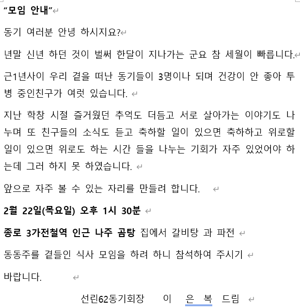 모임안내 작성자김은동|작성시간24.01.30|조회수121 목록 댓글 1 글자크기 작게가 글자크기 크게가 다음검색 현재 게시글 추가 기능 열기 북마크 공유하기 신고 센터로 신고 댓글 댓글 1 댓글쓰기 답글쓰기 댓글 리스트 작성자버디(박윤희) | 작성시간 24.01.30 이 회장님 정말 좋은 말씀입니다. 앞으로 만날 수 있는 친구들은 당연히 줄어가겠지요. 물론 나도 그럴 수 있고....그러니 이런저런 이유 저런 핑계 없이 기회를 만들고 그렇게 자주 만나는 것이 좋겠습니다.소생이야 멀리 떨어져 있어 참석불가하지만 마음은 늘 친구들과 함께 있답니다.꽃피는 봄에 가려하는데 그때 친구들 많이 많이 만나기를 고대합니다. 댓글 전체보기