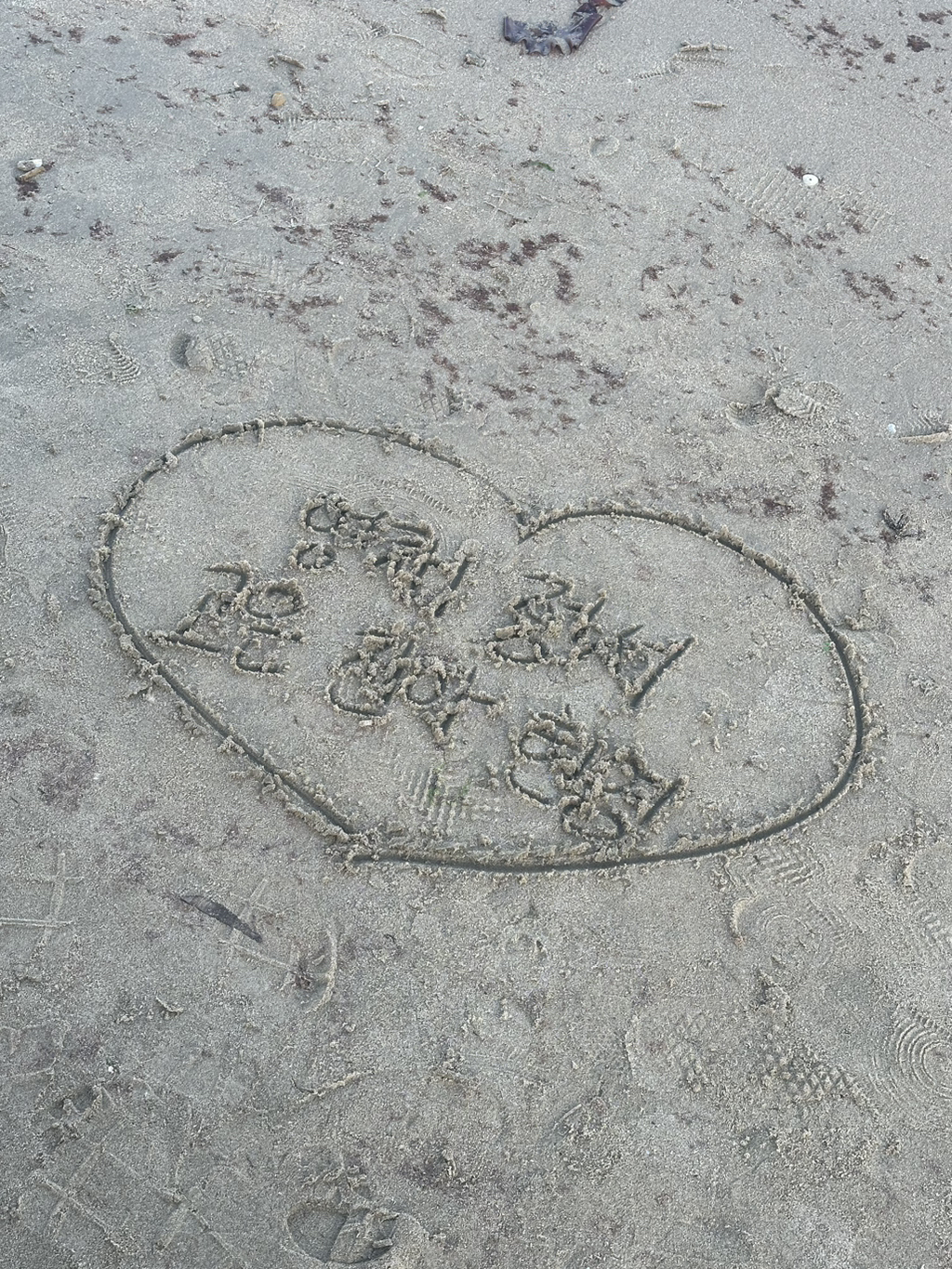’바다를 배경으로 점프샷 찍고 모래에 이름 쓰기‘