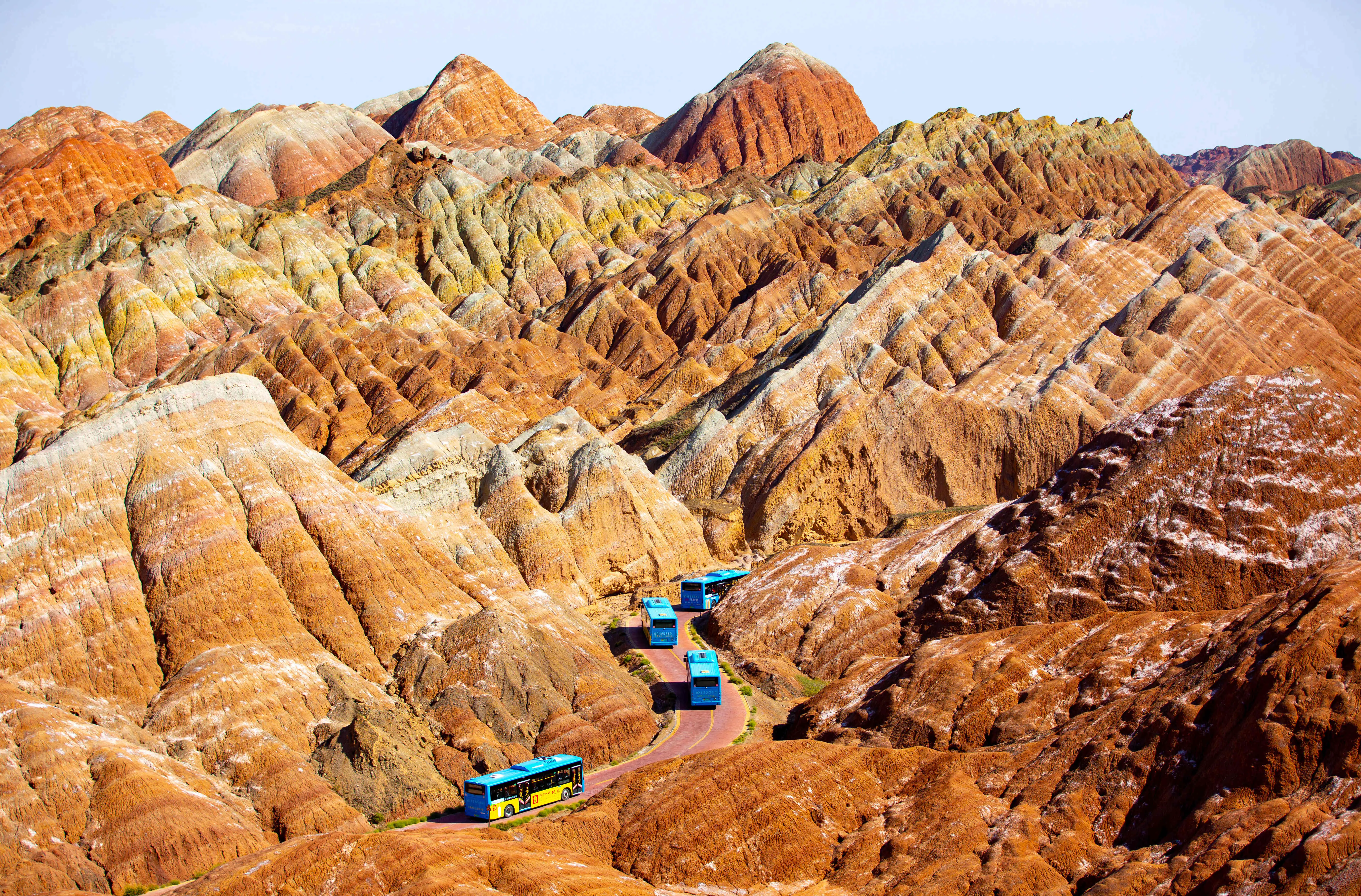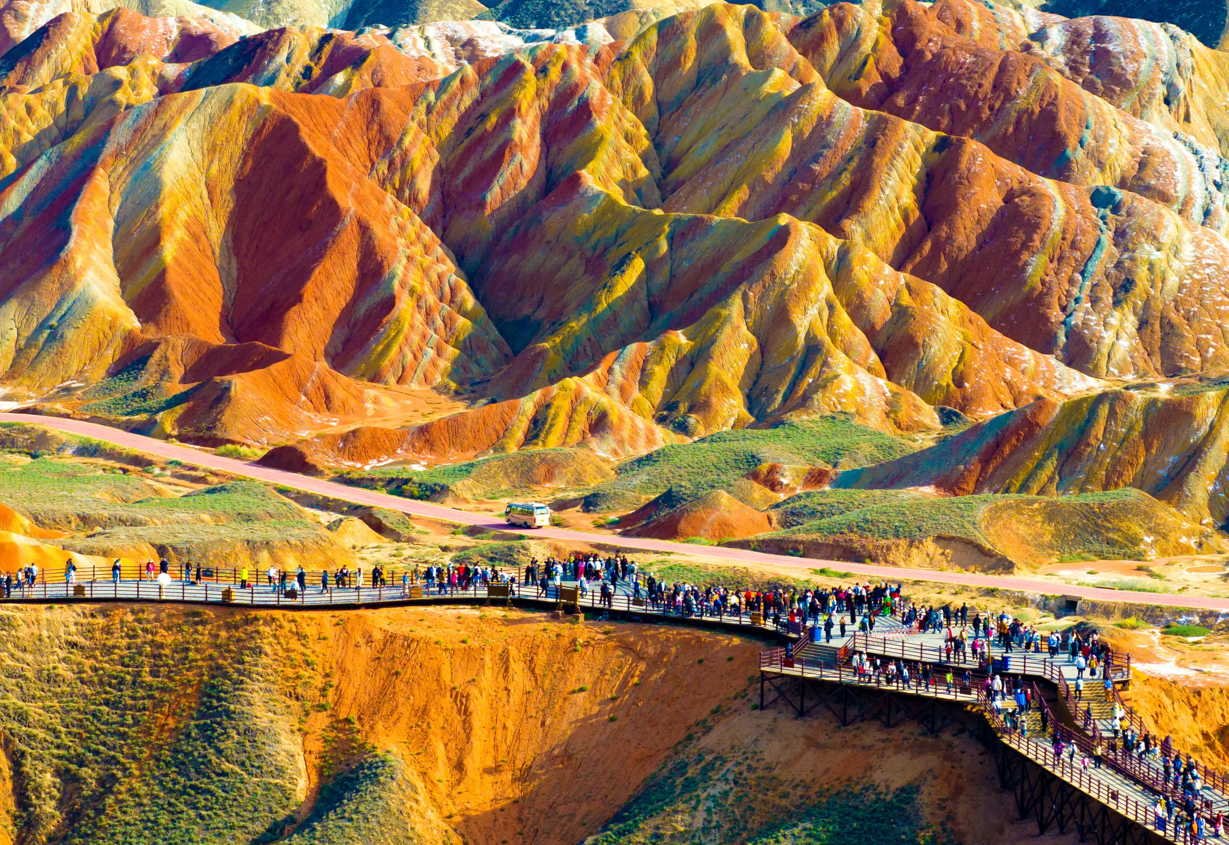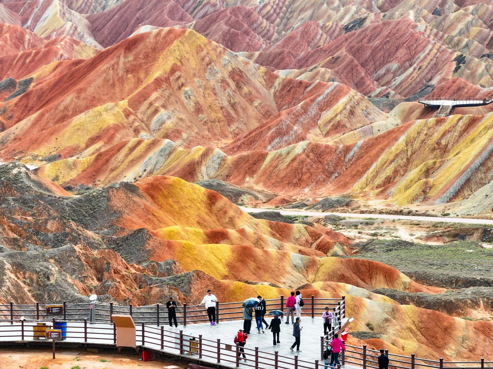 - 칠채산 - 믿을 수 없는 광경 - 죽기 전에 꼭 가 봐야 할 곳 장예 시내에서 40km 떨어진 칠채산은 산의 구릉들이 각각의 색갈로 층층이 채색되어 있는 중국에서 유일한 산악지형이다. 칠채산의 구릉들은 웅장하고, 험준하고, 기이하며, 수려하고, 우아하고, 유유하다. "중국에서 가장 아름다운 단샤(丹霞)", "세계 10대 불가사의한 지리적 경관", "세계에서 가장 인상적인 22개의 풍경 중 하나", "세계 최고의 촬영지", "중국 관광지 TOP20" 등의 명성을 누리고 있다. 전망대 4곳을 셔틀버스가 구간마다 연결해 준다. 빙구단하 빙구단하는 (小西天)과 대서천(大西天)으로 나뉘어져 있으며 해발 1,500m~2500m에 자리하고 있다. 쥐라기 부터 신생대 까지의 붉은 사암 지층에서 풍화와 침식 작용을 거쳐 단샤 절벽, 석벽, 석주 등의 지형으로 형성되었다. 평산호 대협곡 장예시에서 56km 떨어져 있는 평산호 대협곡은 수억 년에 걸쳐 지구 지각의 융기와 풍식, 수식, 화학 침식에 의해 형성된 자연 협곡이며 남북으로 약 7km, 동서로 약 9km에 걸쳐 펼쳐져 있고 지질 구조는 중생대 쥐라기부터 신생대 제3기까지의 퇴적 작용으로 형성된 적색층 지형에 속한다. 다양한 지질 시대의 대표적인 생물 화석이 발견되며, 관광지는 전망대와 협곡의 두 부분으로 나뉜다. (바단지린 사막) |