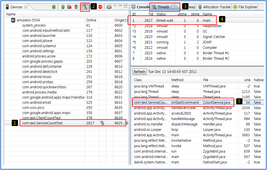 DDMS를 이용해서 서비스 Process의 Thread들을 살펴보자.