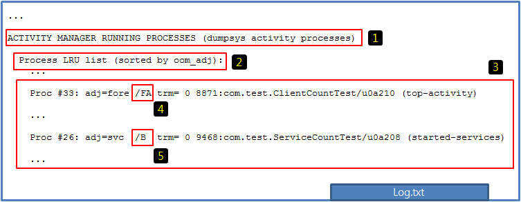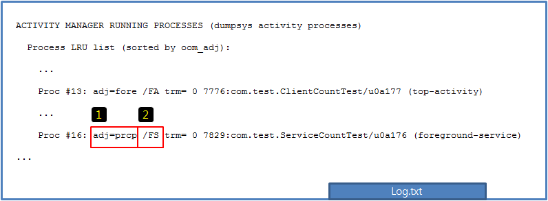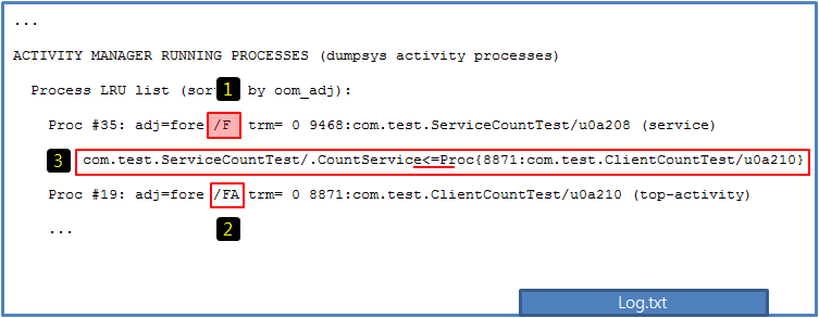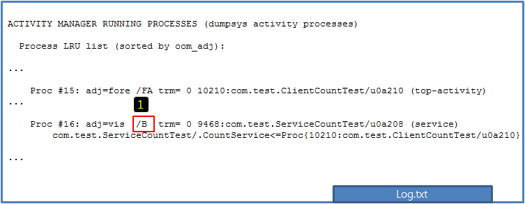 "F"는 Foreground 상태를 의미하고 "A"는 Activity란 의미이다.