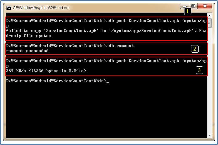 ServiceCountTest.apk를 단말기의 /system/app 폴더로 복사해라는 의미이다.)