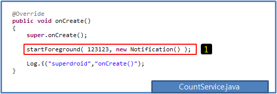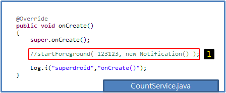 작성자흐규흐규흐규 작성시간 15.04.07 안녕하세요 서비스에 startForeground(123123, new Notification()); 추가시 statusbar 영역에 notification이 추가 되가되는데 강좌내용과 다른 부분이어서 댓글달아봅니다. "ServiceCountTest1이(가) 실행 중입니다. 자세한 정보를 보거나 앱을 중지라혀면 터치하세요" 터치하면 앱을 강제종료하고 제거 할수있는 설정화면으로 넘어갑니다.