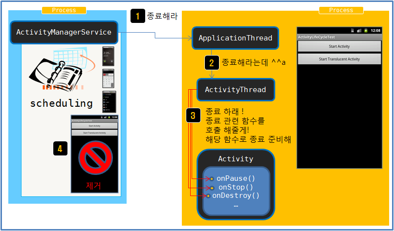 하지만 만일 Activity가 실행중이던 상태에서 ActivityManagerService가 실행/중단/종료를 등을 한다면