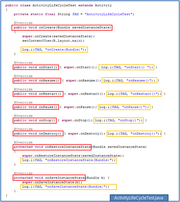 위에서 AndroidManifest.xml에 등록된 Activity 구현을 ActivityLifeCycleTest.java라는