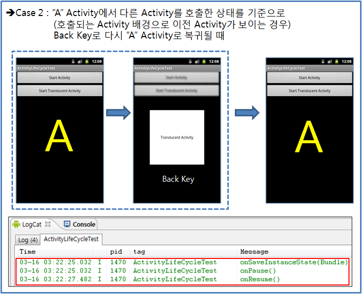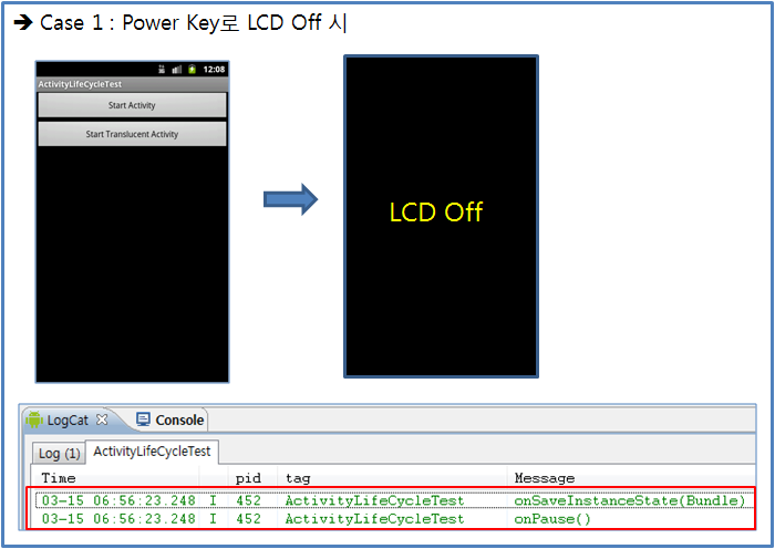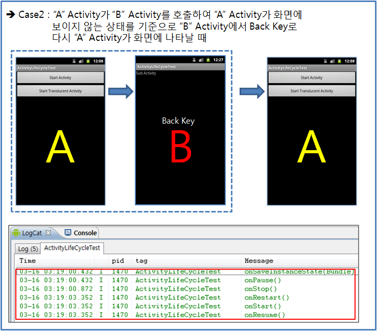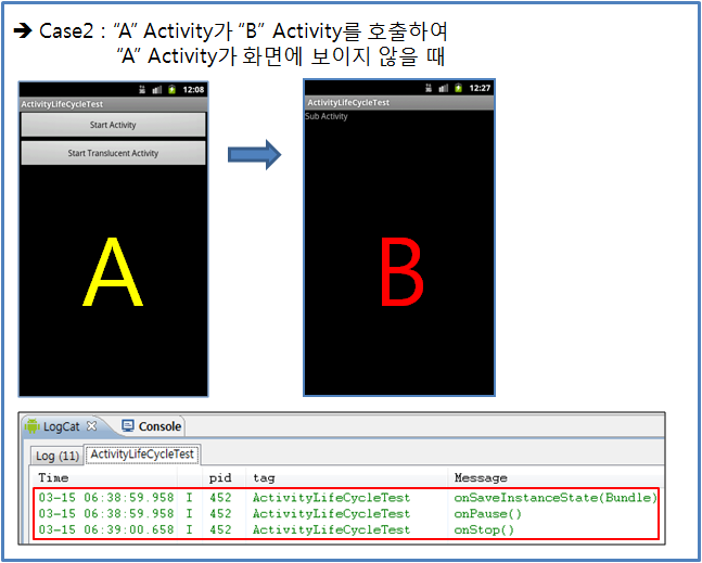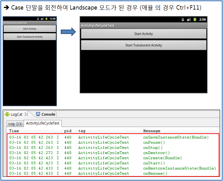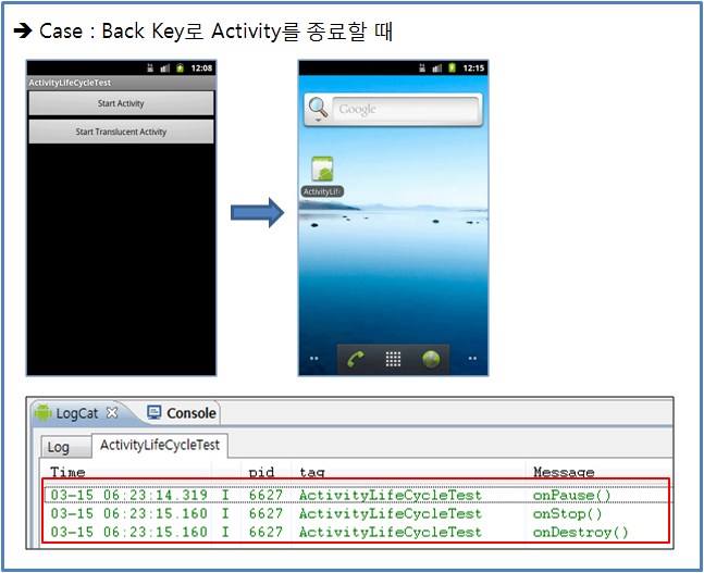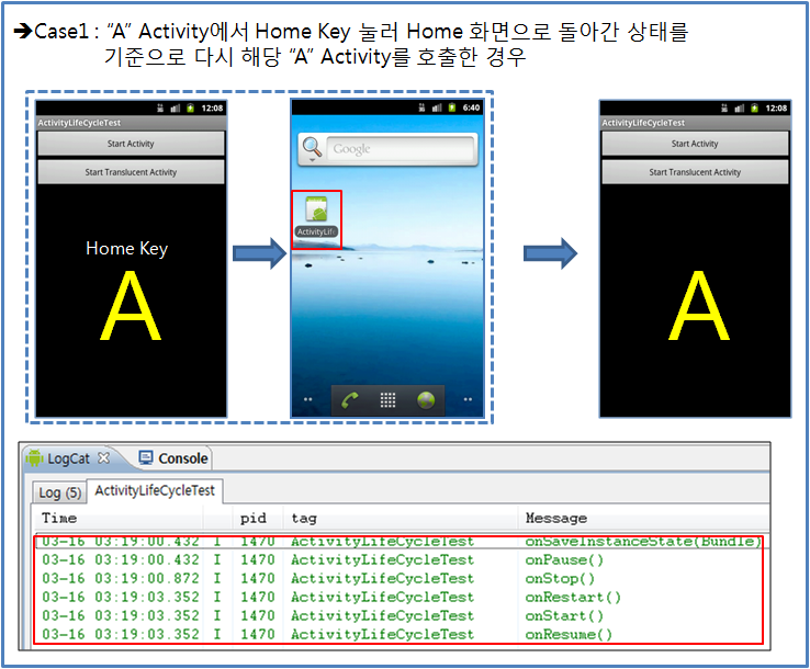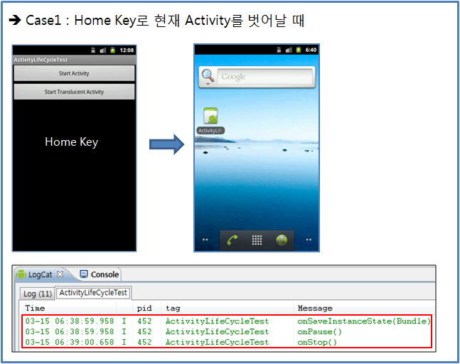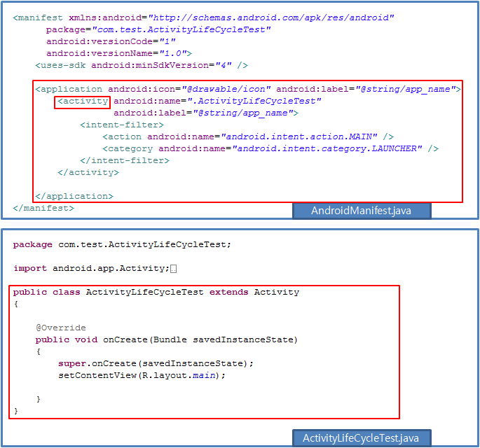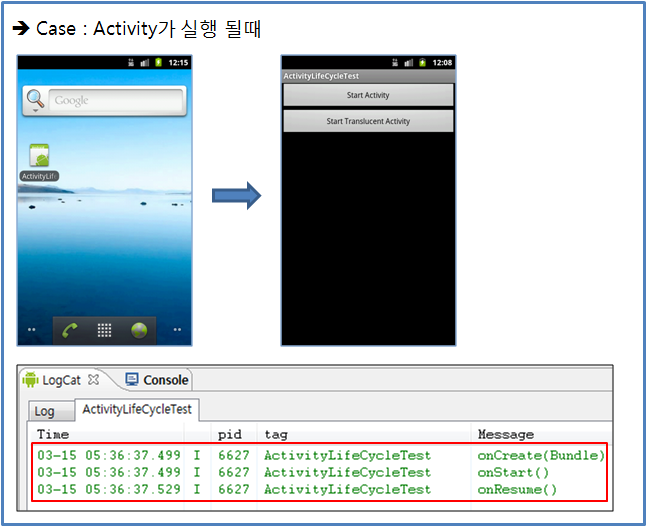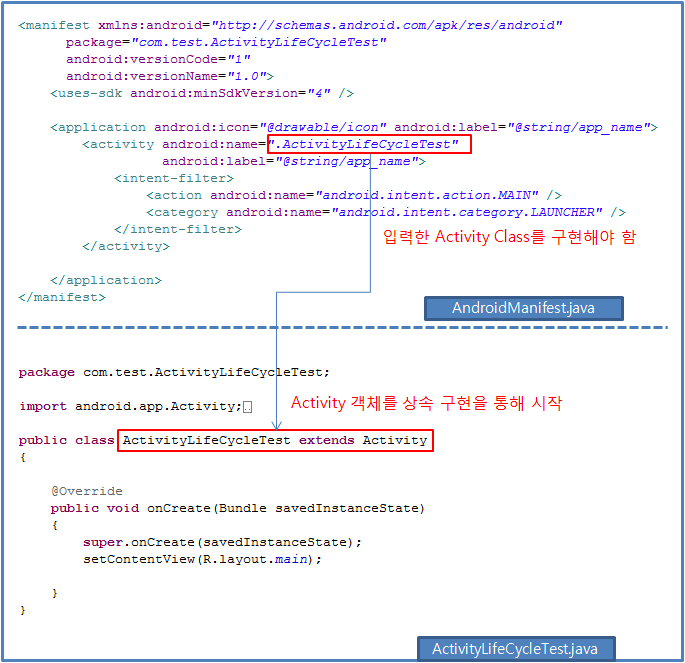 그 구현은 AndroidManifest.xml에 정의한 Class 명(android:name="ActivityLifeCycleTest")으로