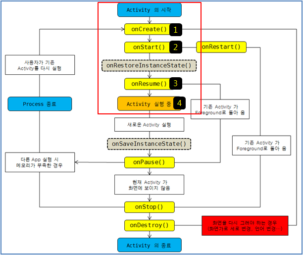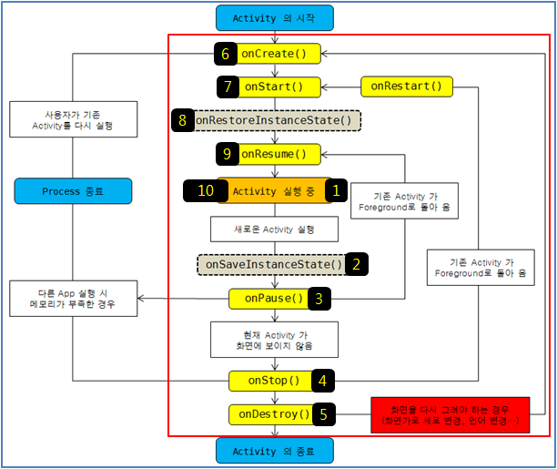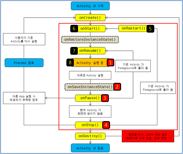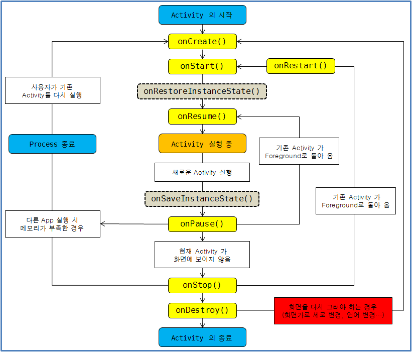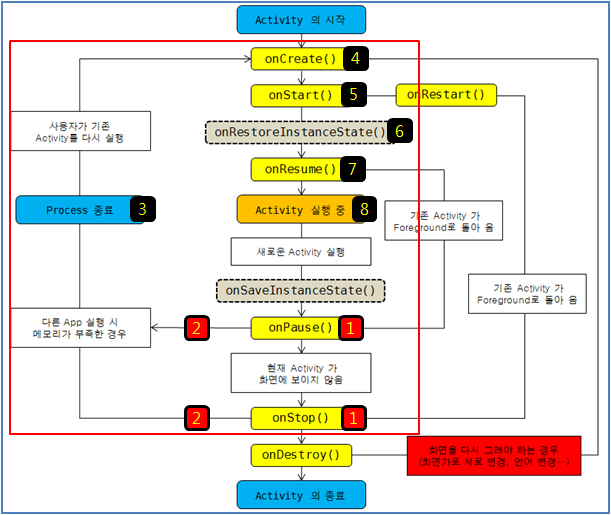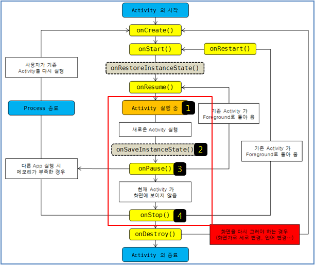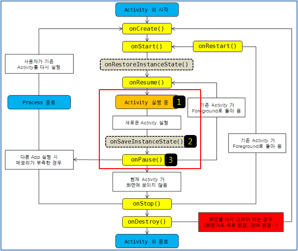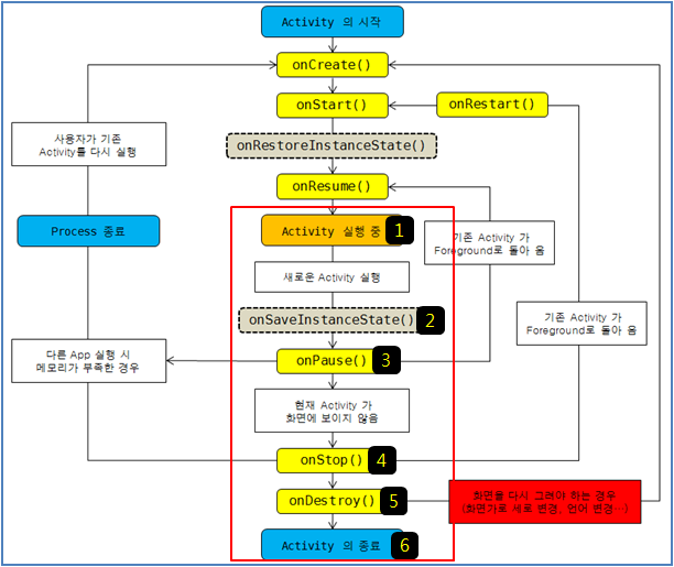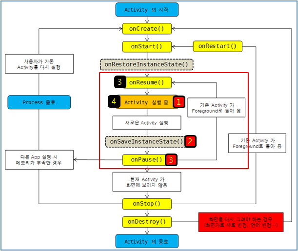 종료의 경우 해당 Activity가 문서를 작성중이라면 미리 준비된 함수를 통해 문서를 저장하는 작업을 할 수 있는 것이다.