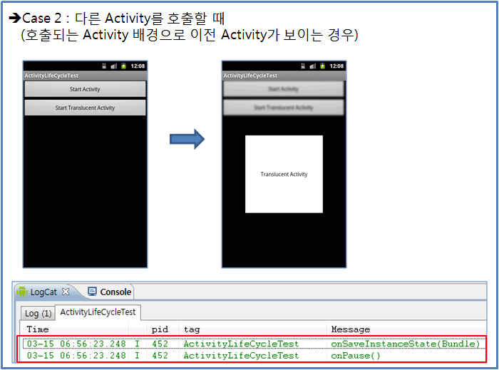 아래와 같이 Activity가 최초 실행될때 호출됨을 볼 수 있다.