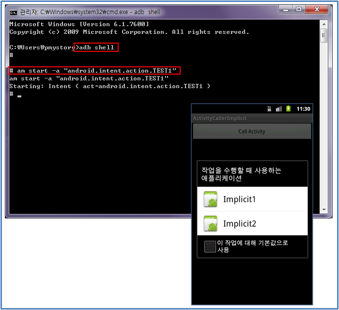 암시적 Intent 또한 ADB Shell에서 ActivityManagerService를 이용할 수 있는 명령어가 있다.