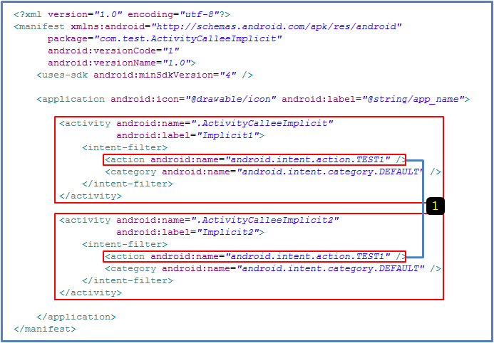 두가지 Activity 모두 <action android:name="android.intent.action.TEST1"> 라고 설정하였다.