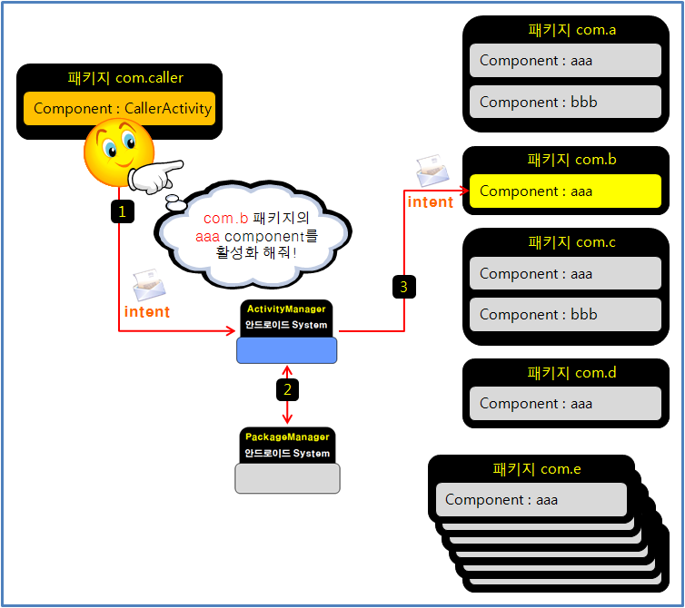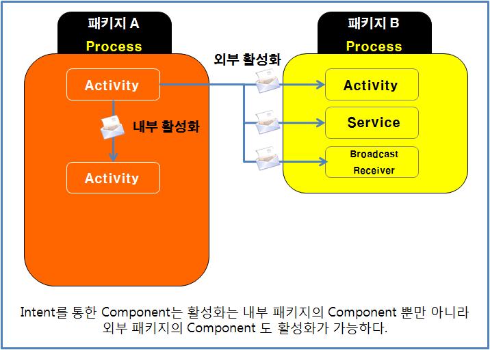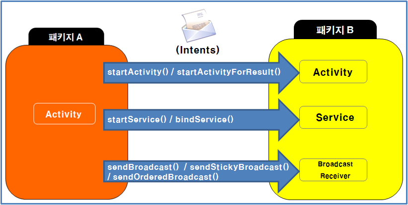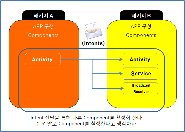 B 패키지의 Components 중 Activity 혹은 Service, Broadcast Receiver가 호출되는 것이다.