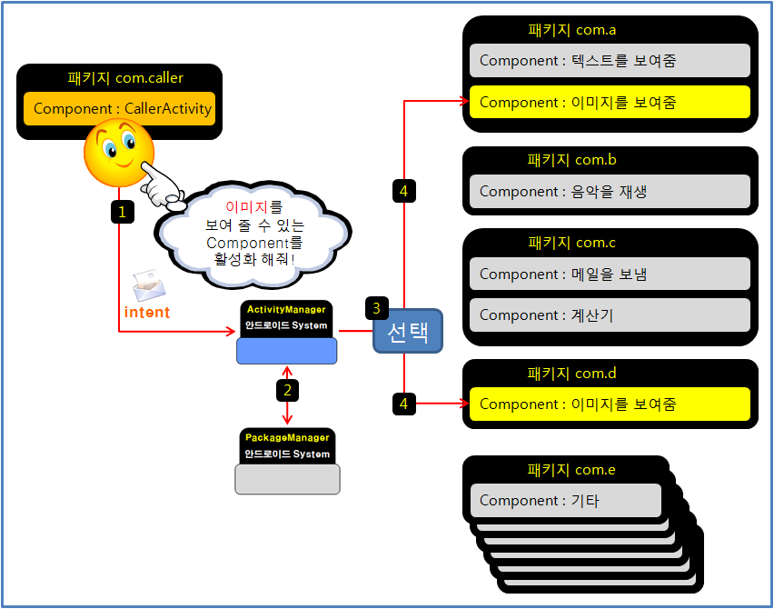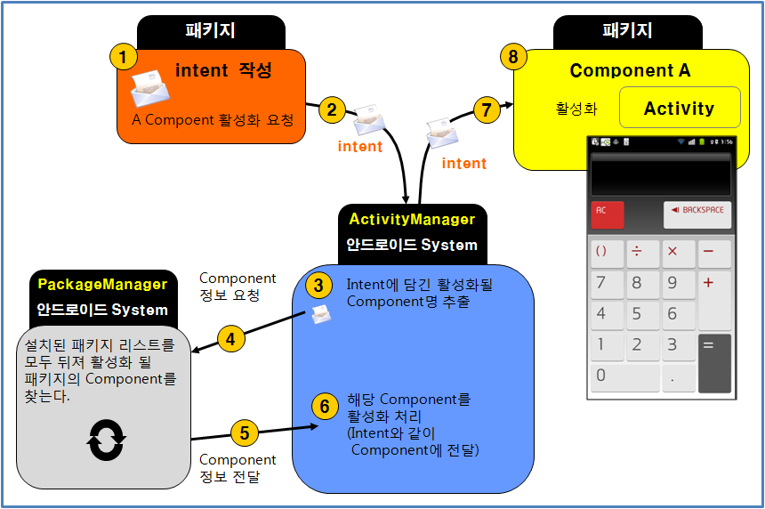 하지만 Intent 객체의 목적은 안드로이드 상에서 Component들을
