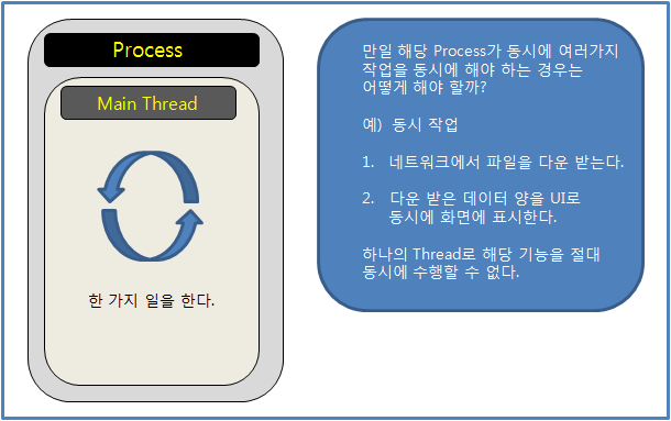하지만 동시에 여러가지 작업을 해야하는 경우 하나의 Thread로 처리하기 힘들다.