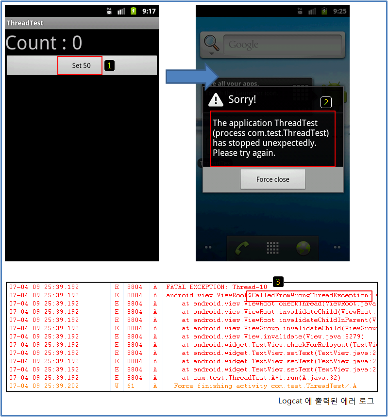 3번과 같이 CalledFromWrongThreadException 이라는 exception을 발생 시킨다.