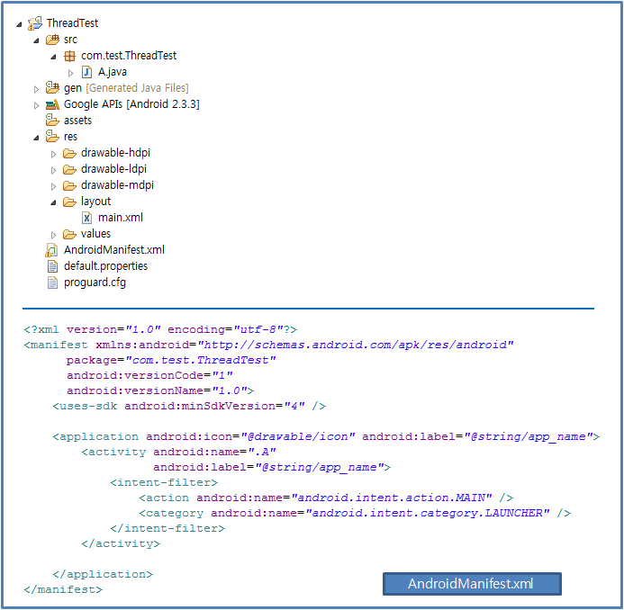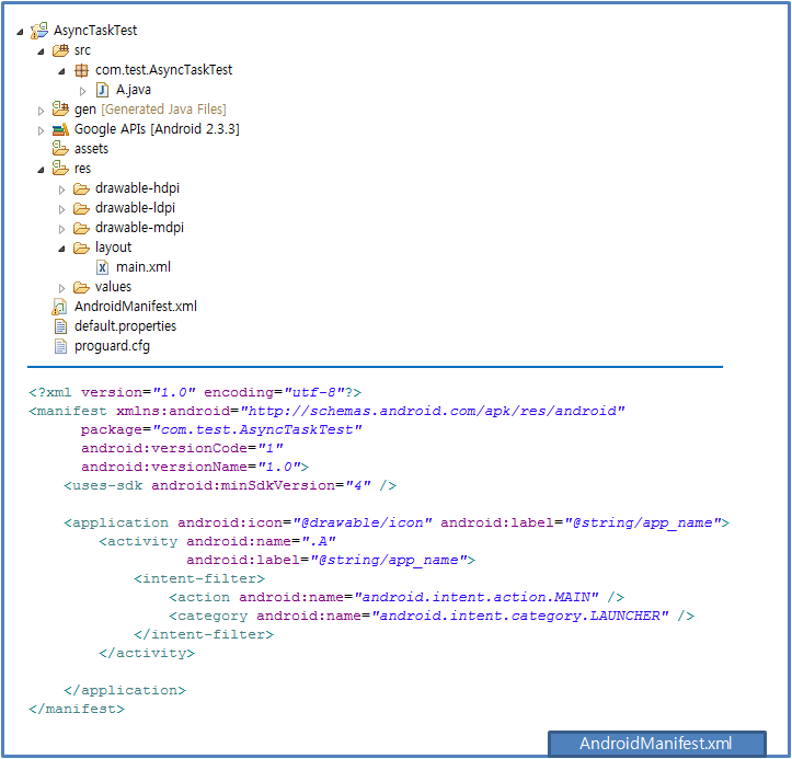 패키지를 하나 작성하였다. 패키지 구성과 AndroidManifest.xml 내용은 아래와 같다.