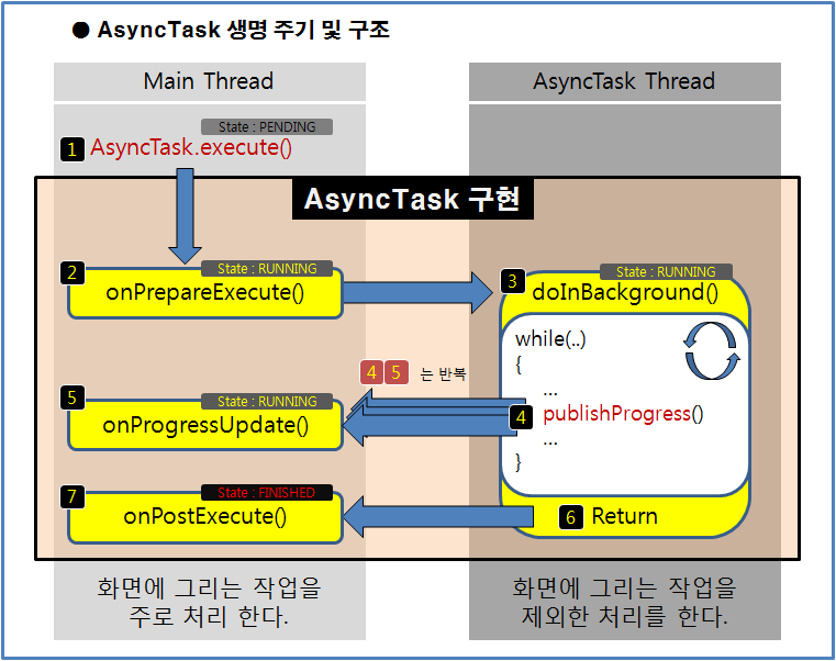 자 구현시 주의할 점은 AsyncTask를 제어하는 함수(execute(), cancel()..)등은