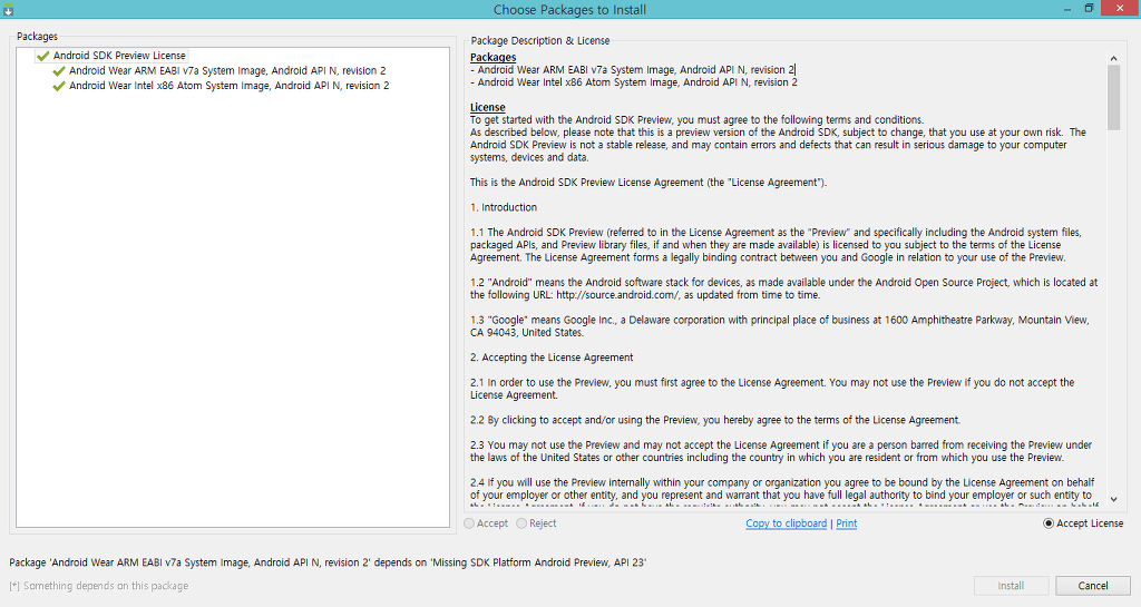 SDK manager API23 설치 질문 작성자김선애|작성시간16.07.02|조회수186 목록 댓글 1 글자크기 작게가 글자크기 크게가 이부분 왜 설치가 안되는지 모르겠습니다 ㅠㅠㅠ missing SDK Platform Android Preview, API 23 이 뭘까요 ㅠㅠㅠ 다음검색 현재 게시글 추가 기능 열기 북마크 공유하기 신고 센터로 신고 댓글 댓글 1 댓글쓰기 답글쓰기 댓글 리스트 작성자슈퍼성근 | 작성시간 16.07.08 안녕하세요.해당 시스템 이미지는 wearable(시계 등) 디바이스 개발을 위해 필요한 사항입니다.wearable 개발을 하시지 않거나 실 단말이 있다면 설치하지 않으셔도 됩니다.그리고 설치가 되지 않는 이유는 해당 설치하시려는 이미지와 연동되어 사용될 sdk가 설치되어 있지 않아서 입니다에러난 sdk를 먼저 설치해보세요.수고하세요 댓글 전체보기
