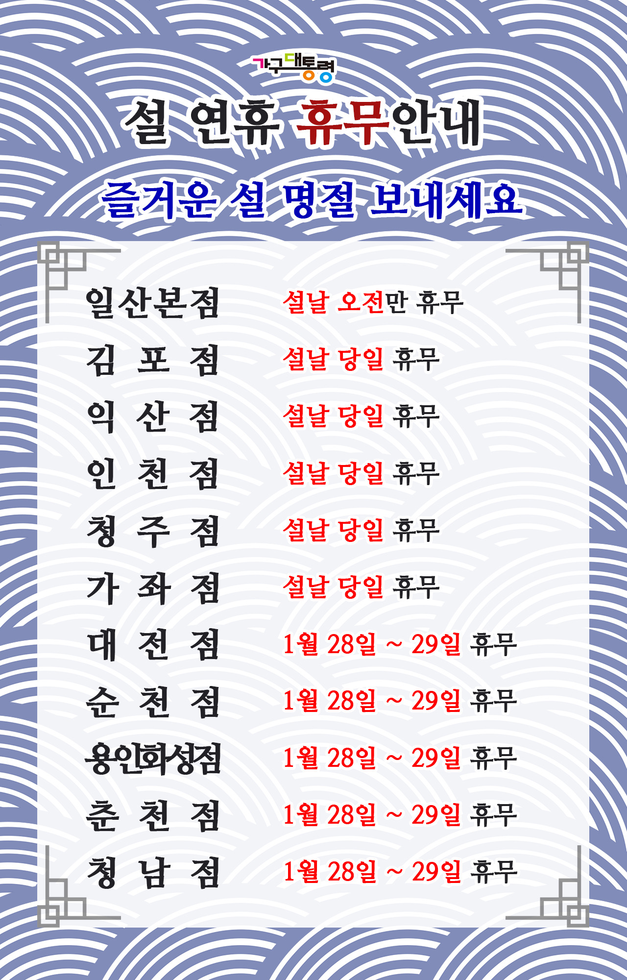 설연휴 휴무안내 - 가구대통령 본점/분점 작성자이뿐선미v가구대통령|작성시간25.01.25|조회수32 목록 댓글 0 글자크기 작게가 글자크기 크게가 다음검색 현재 게시글 추가 기능 열기 북마크 공유하기 신고 센터로 신고 댓글 댓글 0 댓글쓰기 답글쓰기 댓글 리스트