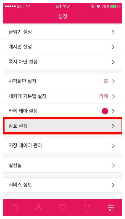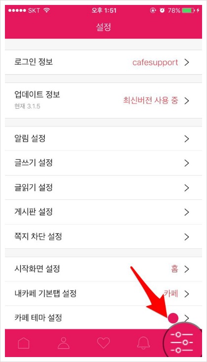 1) [카페앱] 접속 -> 하단 오른쪽 [설정] 아이콘 클릭!
