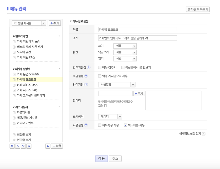 2) 그 다음엔 [메뉴 관리] > 말머리를 설정하고 싶은 게시판을 선택해줍니다.