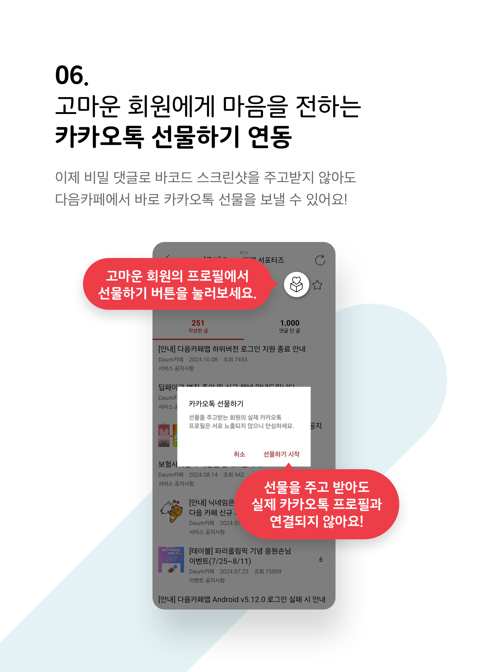 더 나은 다음카페 서비스를 위해 적극적인 의견을 기다리겠습니다. 🥰 피드백을 보내주실 때는 자세한 확인을 위해 접속한 기기모델, OS 버전 및 계정정보까지 전달 부탁드립니다. (저만 볼 수 있으니 안심하세요! 👀)