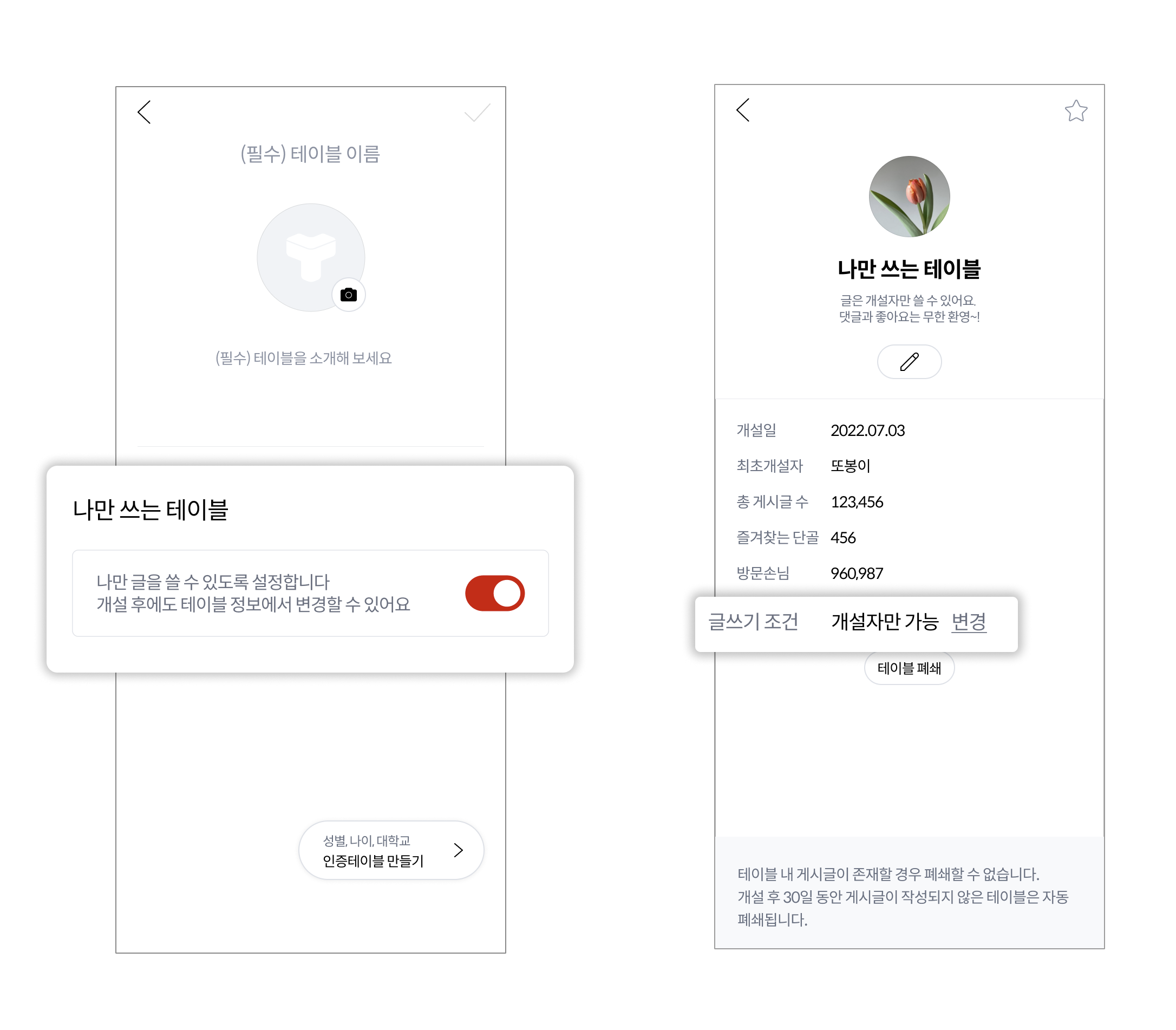 이제는 글 작성 권한을 개설자로 제한하는 '나만 쓰는 테이블'을 개설할 수 있는 기능이 추가되었습니다.