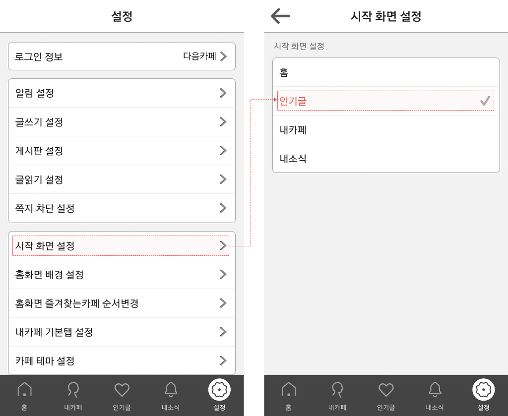 카페앱 탭바 설정-> 시작화면 설정 -> 인기글 선택
