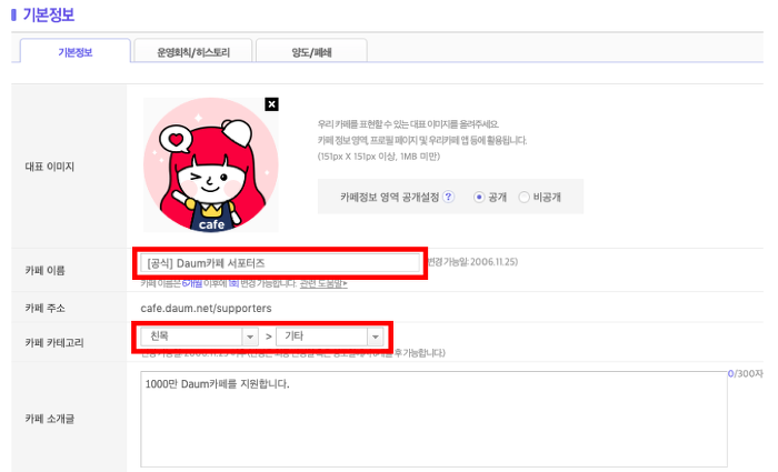 *카페 공개/비공개 설정 변경은 하루 2회까지 가능합니다.