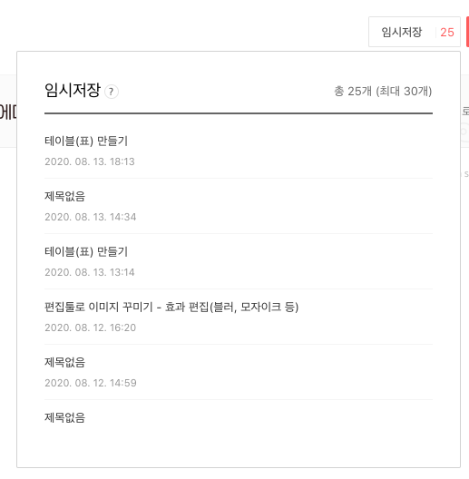 임시저장글은 최대 30개까지 저장되며, 초과 저장시 오래된 순으로 자동 삭제됩니다.