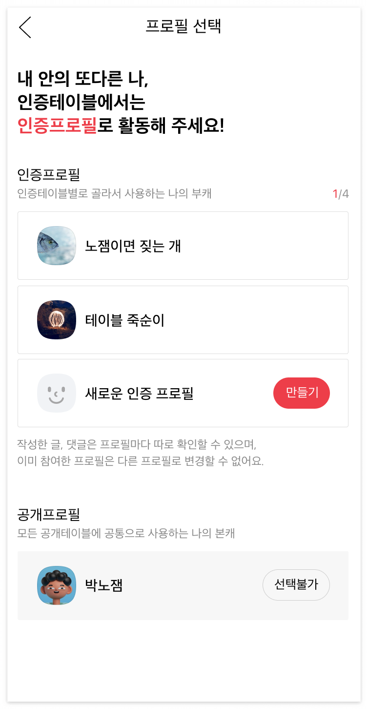 인증프로필은 최대 4개까지 만들 수 있고 인증테이블 입장 시 선택할 수 있습니다.
