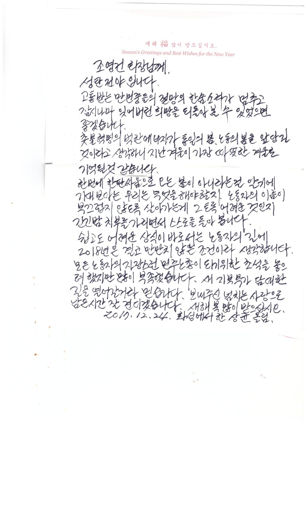화성직업훈련교도소 한상균님 연하장2 작성자구속노동자후원회|작성시간18.04.03|조회수19 목록 댓글 0 글자크기 작게가 글자크기 크게가 다음검색 현재 게시글 추가 기능 열기 북마크 신고 센터로 신고 댓글 댓글 0 댓글쓰기 답글쓰기 댓글 리스트