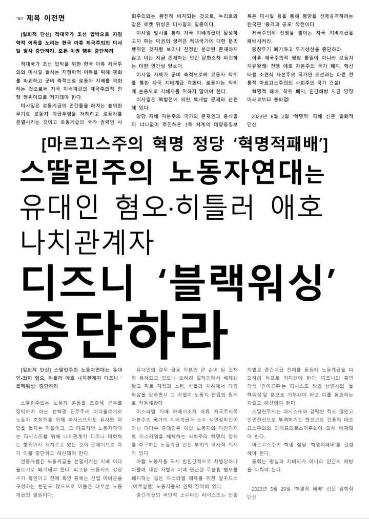 [일회적 단신] 스딸린주의 노동자연대는 유대인•좌파 혐오, 히틀러 애호 나치관계자 디즈니 '블랙워싱' 중단하라
