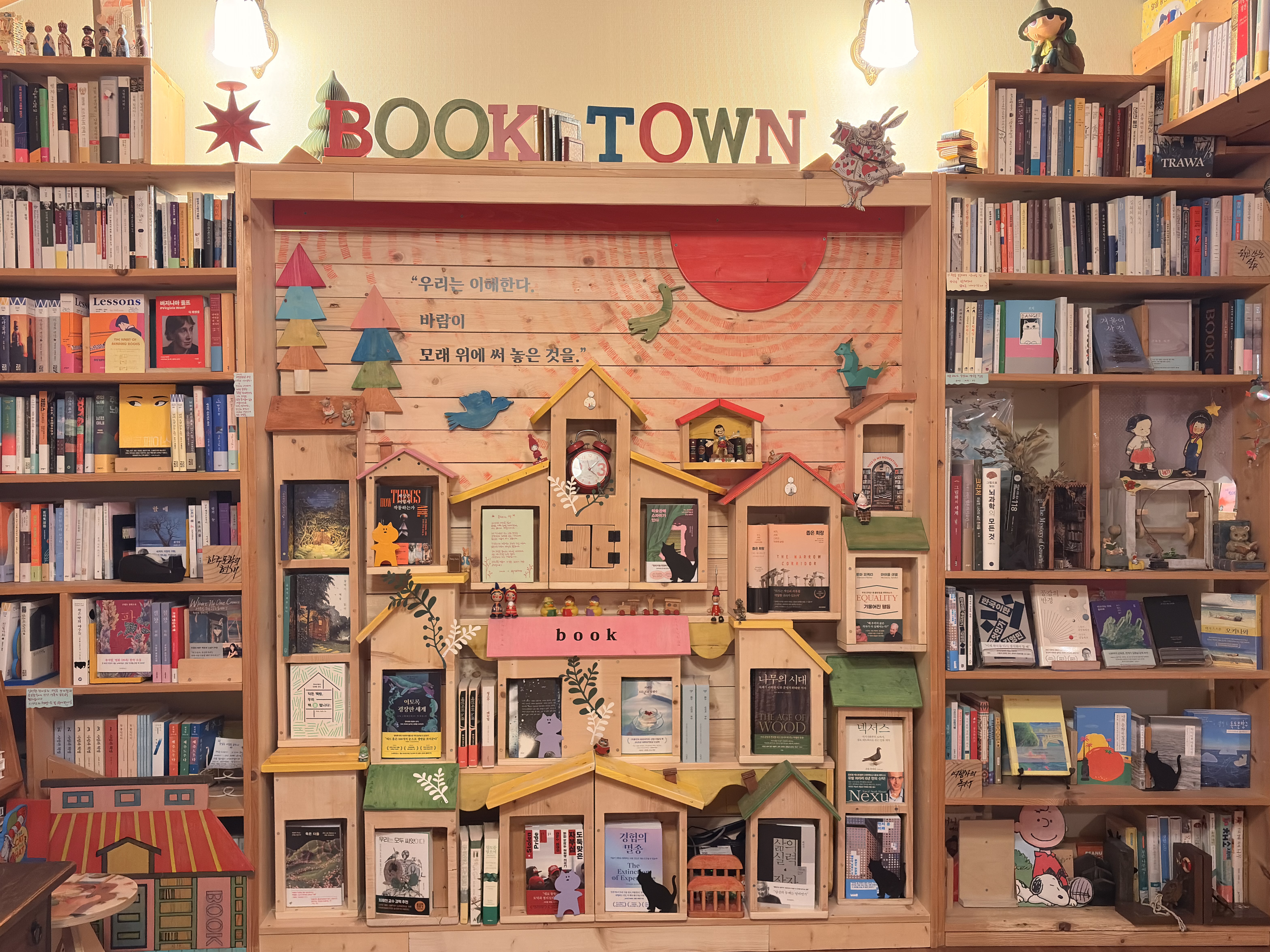 나날이 세상이 변화해가고 있는 지금, 12년차 시골마을 작은 서점은 무엇을 해야 할 것인가를 고민합니다. 학교와 공공도서관이 디지털 물결을 타고 온라인 세상에 ‘접속’할 때 우리는 '접촉'과 '소통'을 생각합니다. 영화에서 보듯 매트릭스 속에 갇힌 하나의 기호로서 존재하는 것이 아니라 살아 숨쉬고 행동하는 인간임을 알게 해주는 '실재하는' 현실로서의 책공간이요. AI 열풍을 타고 모든 것이 가상과 온라인으로 흡수되고 있는 지금 오히려 시골마을 작은책방은 삶의 균형감을 잃지 않도록 해주는 소중한 공간이 될 것이라 믿고 있어요. 숲속 책방지기가 생각하는 '올해의 서점'은 바로 이런 모습입니다. 그 모습을 '북타운'이라 이름붙인 서가로 구현해보았습니다.