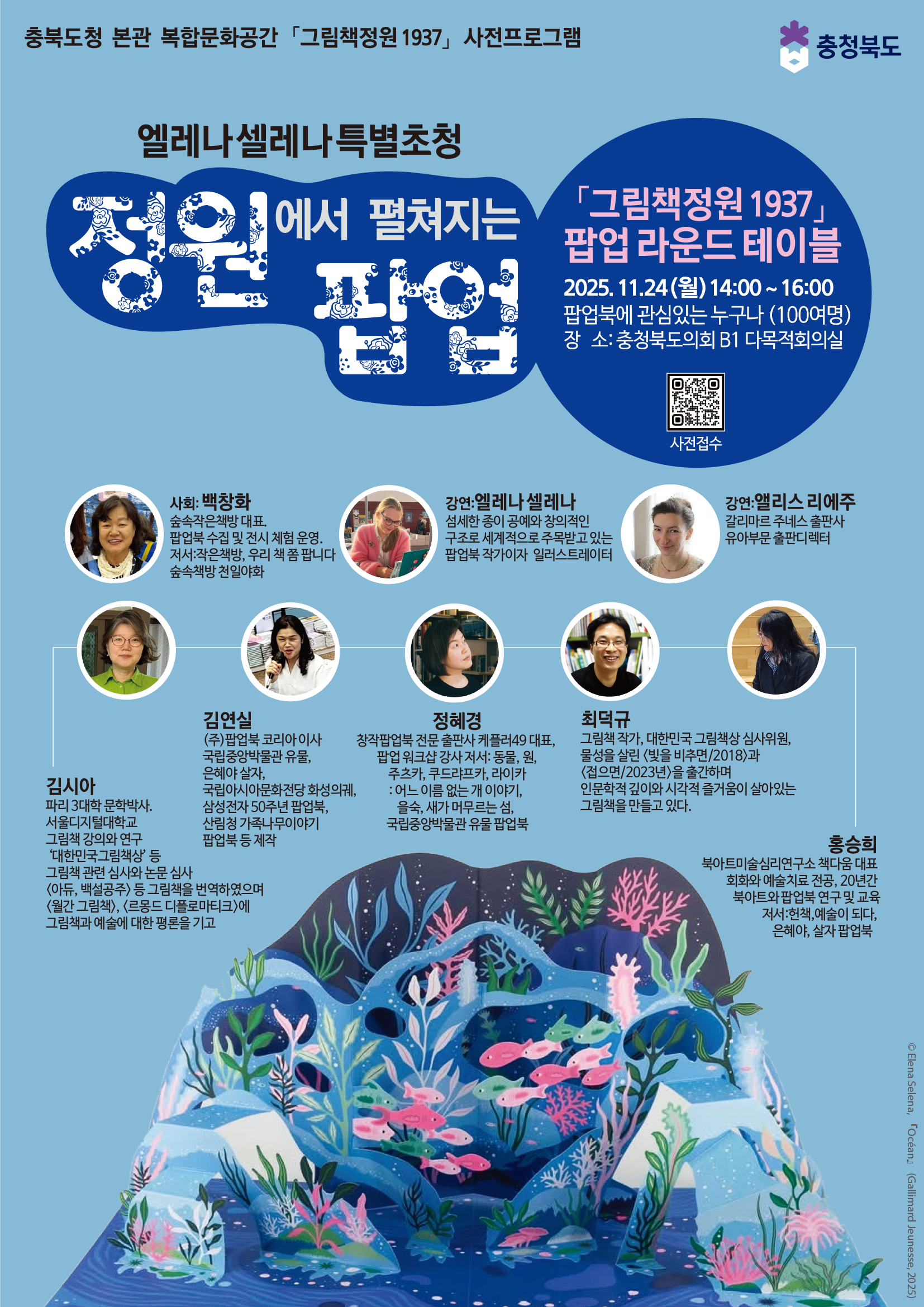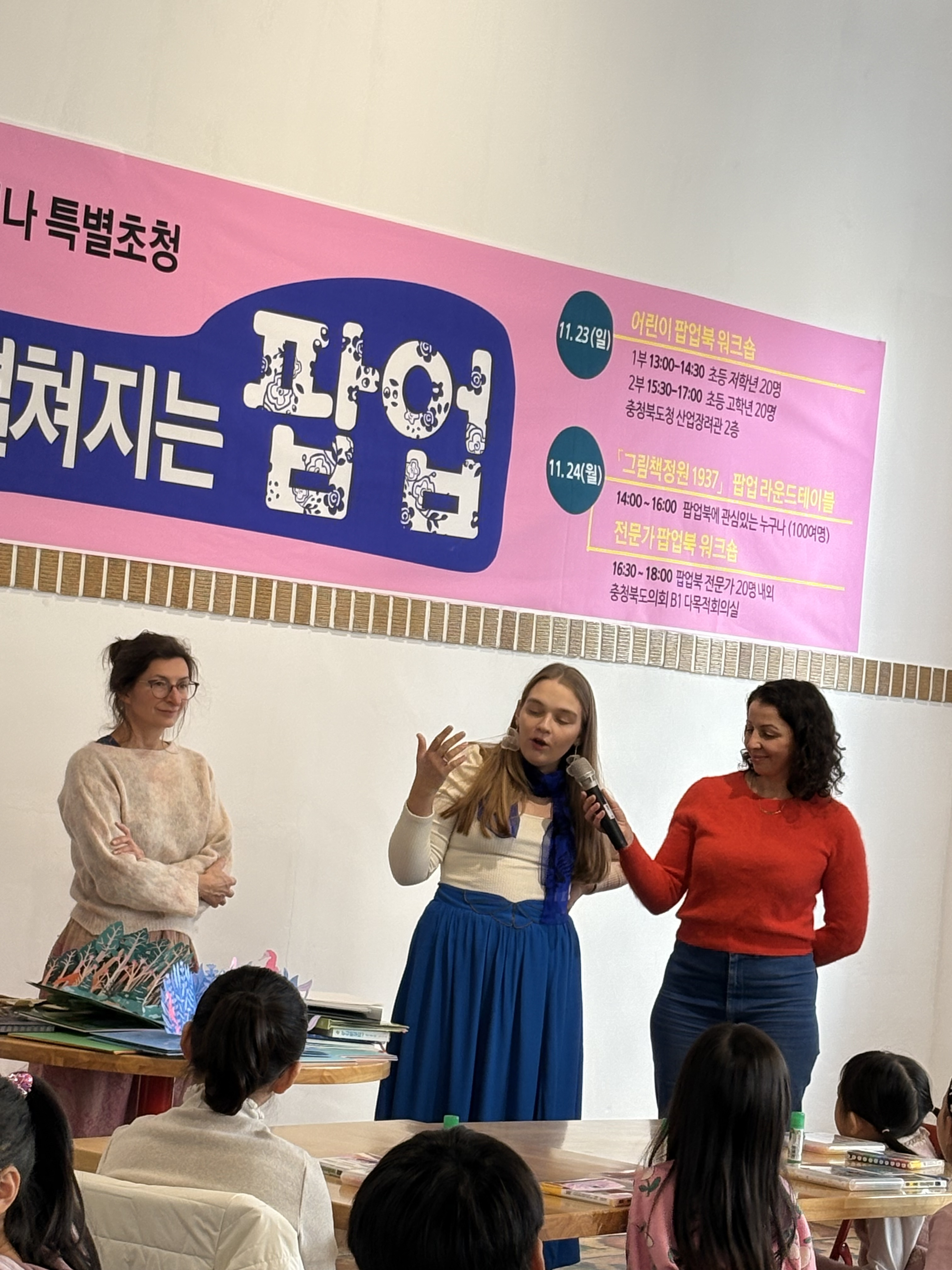 다음날인 11월24일에는 국내에서 팝업북을 전문으로 만들고 있는 작가와 제작자들이 한자리에 모인 '라운드 테이블'이 있었습니다. 엘레나 작가의 작품세계에 대한 강연, 갈리마르 편집자의 유럽 내 팝업북 출판 현황에 대한 발표가 있었고요. 이어서 전문가 토론이 있었어요. 이어서 팝업북을 만들고 있는 분들, 그림책 작가, 활동가 등 전문가들을 대상으로 한 워크숍이 열려서 즐거운 시간을 이어갔습니다.
