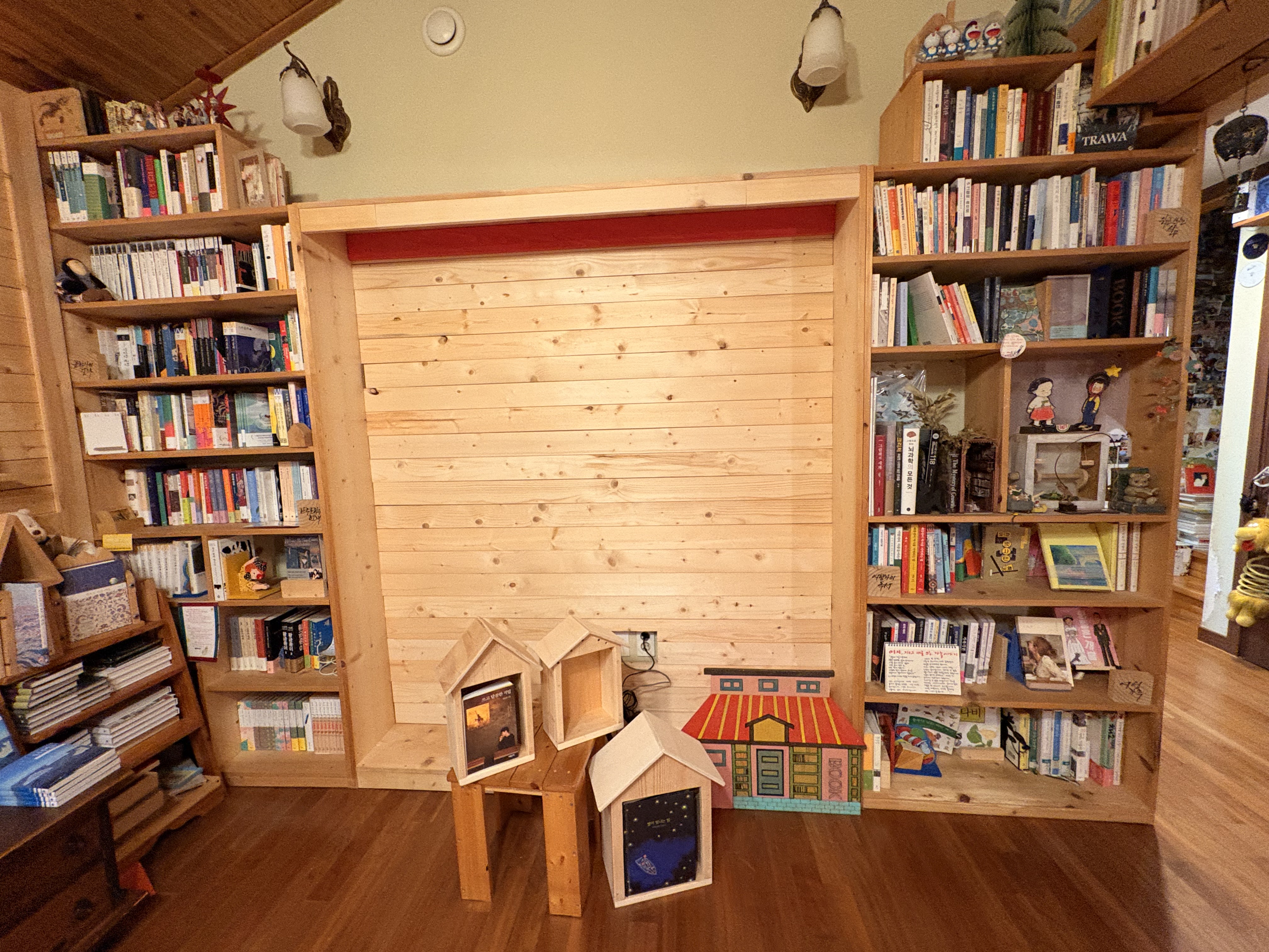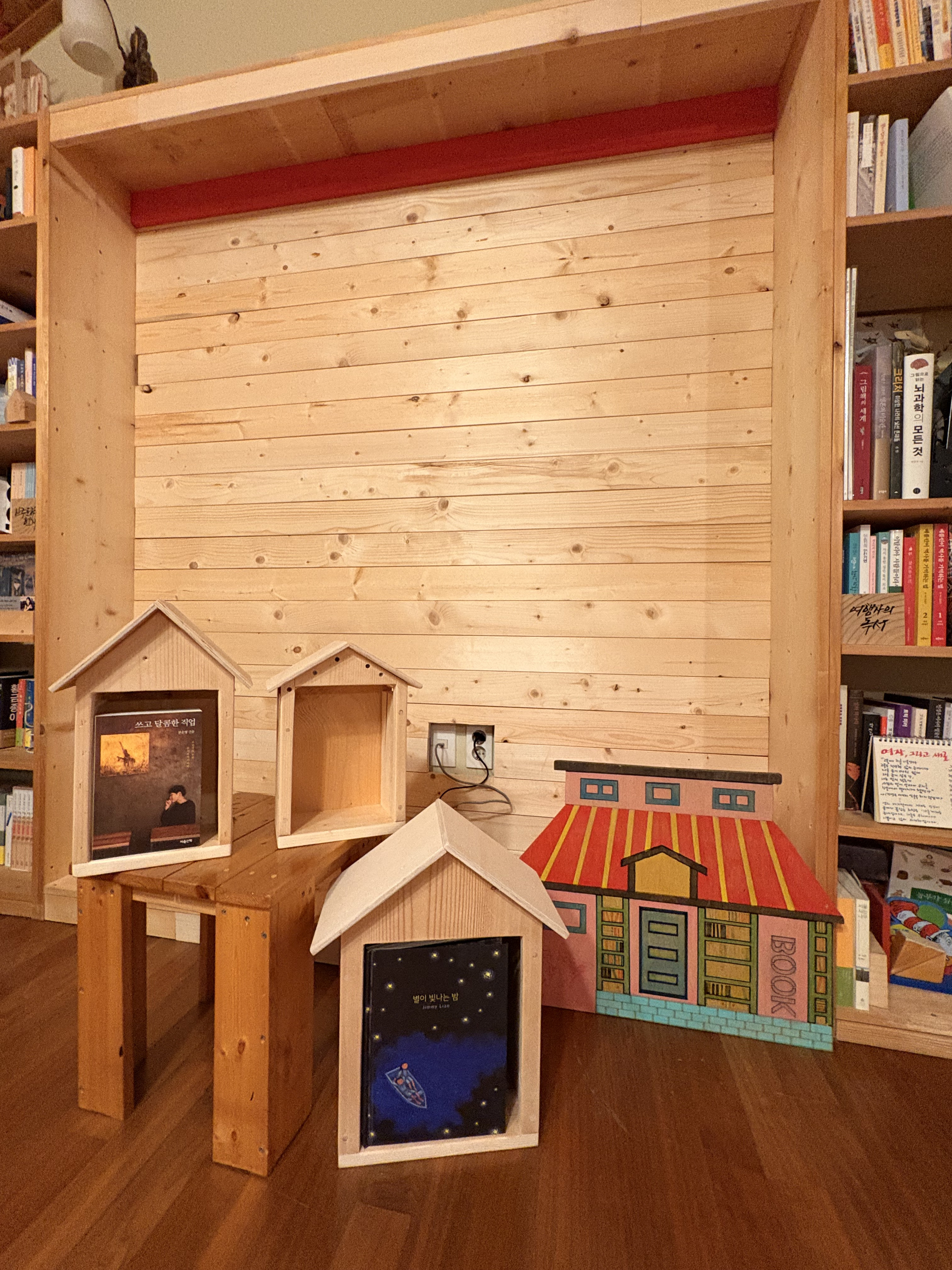 이렇게 비워진 벽면은 사장님이 사랑하는 삼나무-괴산에서 쉽게 구할 수 있고 값도 적정한 까닭에 책방의 주재료로 활약하고 있는-배경 가벽을 세워주고요, 여기엔 "북타운"이 만들어질 예정이랍니다. 말 그대로 책의 집들이 들어설 거예요. 책 한 권 한 권을 소중히 여기고 그 책이 주인공이 되는 그런 단독 서가. 층층이 쌓아올린 책들의 집이 어떤 모습으로 완성될지 기대해주세요.