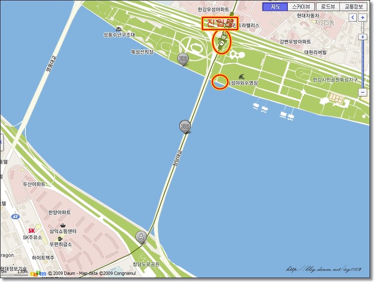 아래 청담대교 촬영포인트에서 촬영을 마친 후 차를 몰고 계속 직진(아래 샛길) 하다 보면 잠실대교 촬영포인트를 만날 수 있습니다.