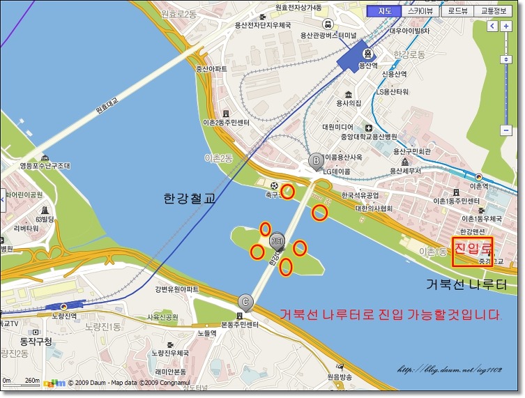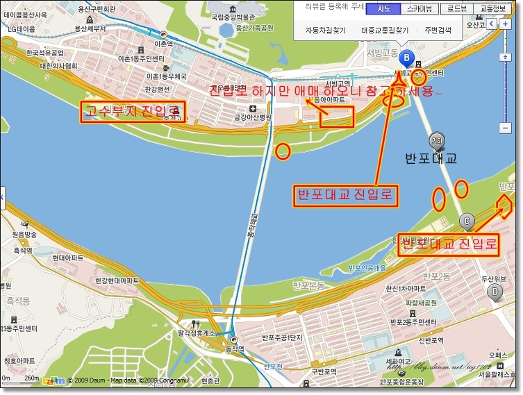 강변북로 반포대교 방면으로 진행하시다 보면 이촌지구로 들어가는 입구가 있습니다. 그곳으로 들어가신 후 동작대교 방면으로 계속 주행
