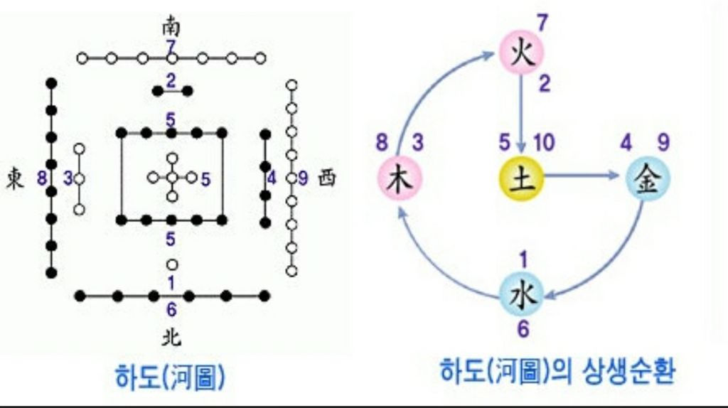 1~10의 수: 하도는 1부터 10까지의 수를 사용하여 우주 만물이 생성되는 기본 원리(오행과 생성수)를 나타냅니다.