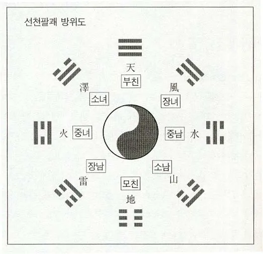그렇기에 선천팔괘는 하늘과 땅 사이의 공간에 있는 우주의 대자연을 표현한 것이